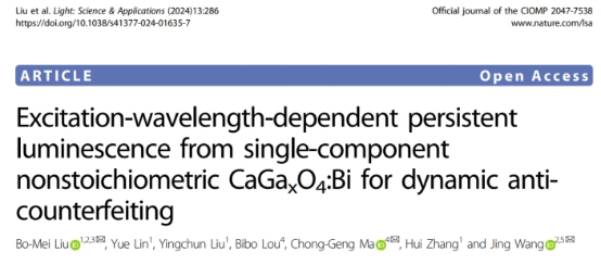 Recently, Associate Professor Liu Bomei from our college's Professor Zhang Hui's team, in collaboration with researchers from Sun Yat-sen University and Chongqing University of Posts and Telecommunications, wrote the academic paper "Excitation-wavelength-dependent persistent luminescence from single-component nonstoichiometric CaGaxO4:Bi for dynamic anti-counterfeiting," which was published on October 10, 2024, in the international top optics academic journal《Light: Science & Applications》(Nature sub-journal; impact factor: 20.6). Associate Professor Liu Bomei from our college is the first author and corresponding author of the paper. The research work is based on the Jieyang Branch of the Guangdong Provincial Laboratory of Chemistry and Fine Chemicals (Rongjiang Laboratory), with Guangdong University of Technology as the first completing unit of the paper.