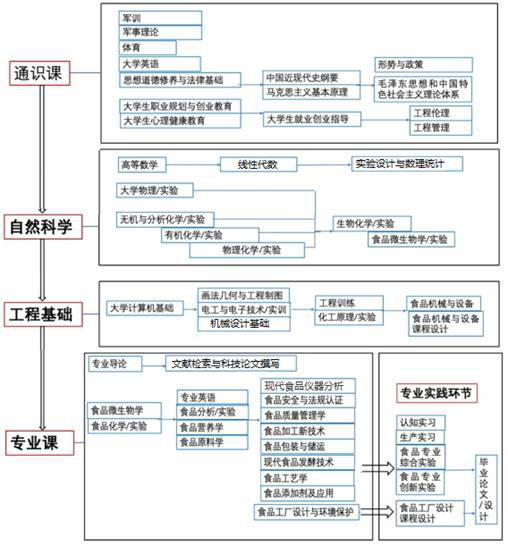 (3) Professional basic courses: including food chemistry, food raw materials science; food nutrition, food analysis (including experiments), food safety and regulations certification, literature retrieval and scientific paper writing, accounting for 10.6%.