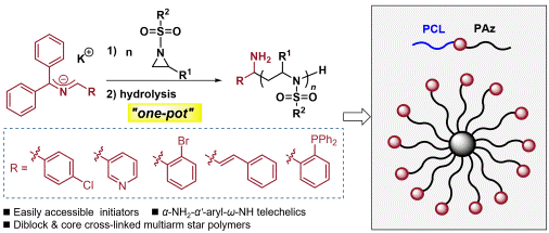 N-The living anionic ring opening polymerization of sulfonyl substituted azacyclopropanes is an important synthetic method for the synthesis of linear polyethyleneimine based polymers. However, the initiator of the polymerization is often limited to the non functionalized n-benzyl-sulfonamide, which is not conducive to the functionalization of the end of the polymer chain or the synthesis of block or complex topological polyethyleneiminesBased polymer materials.In this study, 2-azaallyl anions were used as initiators for ring opening polymerization of N-sulfonyl substituted azacyclopropanes for the first time, and polyaazacyclopropane telechelic polymers with primary amine as terminal group were synthesized by ring opening polymerization and hydrolysis of end group imines by "one pot method" (Fig. 1).The polymerization products have clear end groups, narrow dispersion (ࠨ < 1.20), and the molecular weight can be strictly controlled by the ratio of monomer to initiator.Kinetic studies revealed the first-order reaction kinetics and "living" polymerization characteristics with controllable molecular weight.The end group of the synthesized telechelic polymer has primary amine group, which can further initiate the ring opening polymerization ofε- caprolactone to prepare paz-b-pcl block polymer under the catalysis of stannous octanoate.In addition, theω- NH end group of the telechelic polymer can also be used as the initiator group to synthesize the nuclear crosslinked multi arm star polymer by ring opening polymerization with excess bisphenol a crosslinking agent substituted by diazocyclopropane in the presence of phosphonitrile ligand t-bu-p.4