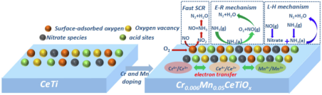 新型催化剂的设计及其应用是清洁化学技术团队的研究方向之一。在Ind. Eng. Chem. Res.的文章中,制备了Cr掺杂CeTi催化剂,该催化剂具有良好的低温活性和抗H2O及SO2中毒的性能。Cr的改性能有效提高催化剂的比表面积、氧空位、Ce3+的含量、表面酸性以及氧化还原能力,从而提升催化剂的低温活性和拓宽活性温度窗口。Cr掺杂CeTi催化剂形成更多的表面吸附氧,更易产生NO2,有利于“快SCR”反应。另外,Cr与Ce的电子转移也是CrCeTi催化剂具有优良催化活性的重要因素之一。采用In-situ-FTIR证实了该催化剂的反应遵循Eley-Rideal(E-R)机理。采用TG-MS证实Cr的掺杂减少催化剂表面吸附的SO2,促进硫酸氢氨的分解,因此显著地提高了催化剂的抗硫性能。