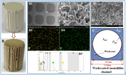 在AIChe Journal的文章中,作者制备了Ce改性都Cu-SSZ-13整体催化剂。将Ce的前驱体与尿素浸渍到整体催化剂的涂层中,尿素在焙烧过程中燃烧,其本身占据的空间被释放后形成多孔的涂层结构,结果表明Ce优化涂层后显著地提高了Ce2Cu-Z-SCS催化剂的低温活性和活性温度窗口,其水热稳定性和抗硫性能也明显优于Cu-Z催化剂。NH3-TPD的实验结果表明CeO2的改性显著提高了NH3在涂层中的扩散速率,这归因于涂层中形成的多孔结构。Ce改性后,催化剂酸性增强。此外,CeO2的引入促进了NO氧化成NO2,从而触发“快SCR”反应。对气体在涂层中扩散时间的模拟计算证实涂层中的多孔结构提升了反应物的扩散效率,进而提高SCR反应速率。机理的研究表明Brønsted酸位点是SCR反应的主要活性位点,该反应路径遵循E-R机理。通过微观和宏观的分析,CeO2的掺入优化了催化剂的物化特性以及促进反应气体的扩散,多孔的结构产生更多暴露的活性位点,进而有效地提高SCR过程气体的传质速率和反应速率。