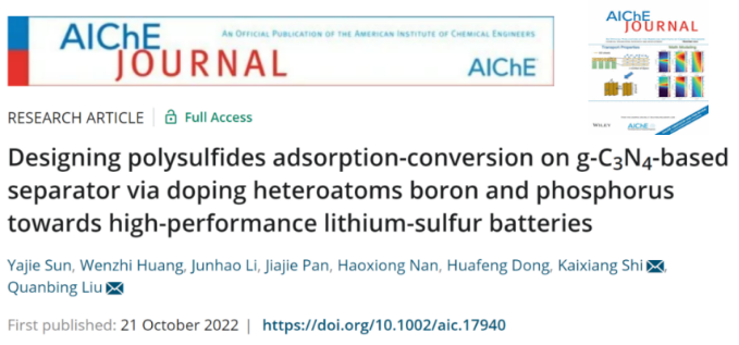 绿色过程团队刘全兵教授在锂硫电池研究领域取得重要进展,题为“Designing polysulfides adsorption-conversion on g-C3N4-based separator via doping heteroatoms boron and phosphorus towards high-performance lithium-sulfur batteries”的研究成果发表在化工领域TOP一期刊AIChE Journal上。该工作以DFT计算为指导,通过设计、构筑杂原子掺杂g-C3N4模型应用于锂硫电池隔膜,为获得高性能锂硫电池提供了新策略。本论文通讯作者刘全兵教授/石凯祥博士后,第一作者硕士研究生孙雅洁,均是疯AV