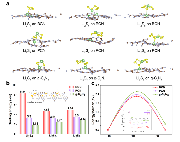由于高理论能量密度、正极材料储量丰富以及环境友好等优点,锂硫(Li-S)电池作为高比能二次电池,被认为是最有前途下一代储能系统之一。然而,硫及放电终产物导电性差、多硫严重的穿梭效应以及其氧化还原动力学缓慢等问题,制约了锂硫电池的大规模商业应用。为此,课题组以理论计算为指导,设计出掺杂原子(硼B和磷P)的碳三氮四(g-C3N4)应用于锂硫电池隔膜,能起到“一石多鸟”的作用。结果表明,掺硼的g-C3N4基隔膜(BCN)可以明显改善锂硫电池的电化学性能。其原因主要包括:i)BCN可以增强对多硫化物的锚定作用,避免其溶解迁移到负极;ii)优越的电催化作用可以增强氧化还原动力学,强化多硫化物转化的催化转化;iii)还降低了锂离子的扩散能垒,提高了Li+迁移率,明显提高正极活性材料的利用率。该工作对科研人员在未来研究中合理设计电极材料和电池结构,促进锂硫电池的商业化应用,具有重要的指导意义。论文DOI:10.1002/aic.17940