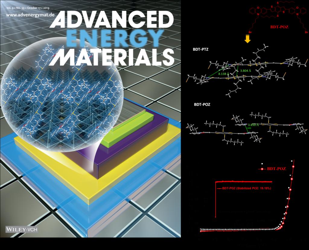 有机光电材料与功能高分子团队蔡宁副教授和霍延平教授等人,联合香港城市大学Tsang Sai-Wing 教授在钙钛矿太阳电池研究领域取得重要进展,研究成果发表在国际能源材料领域的权威期刊Adv. Energy Mater.(IF=24.88,一区Top期刊),并于近日作为前封面文章出版(Rational Design of Dopant-Free Coplanar D-p-D Hole-Transporting Materials for High-Performance Perovskite Solar Cells with Fill Factor exceeding 80%. Yatong Chen, Xiuwen Xu, Ning Cai,* Sainan Qian, Ruixi Luo, Yanping Huo, Sai-Wing Tsang* Adv. Energy Mater. 2019. 9(39), 1901268)。本工作中,基于理论计算的支撑,将合理设计并合成的D-p-D 型非掺杂空穴传输材料应用于反式平面钙钛矿太阳电池中,获得了最高81.7%的填充因子,并获得了19.16%的器件光电转换效率,同时揭示了分子结构/分子聚集态结构—空穴迁移率—器件性能之间的内在关系,为新型空穴传输材料的设计提供了新的思路。本工作我校研究生为论文第一作者,蔡宁副教授为论文第一通讯作者,我校为论文第一通讯单位,香港城市大学为论文的第二通讯单位。