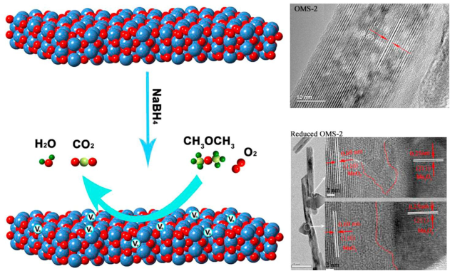 发表在Chemical engineering journal(化工四大期刊之一)题为“Enhanced catalytic performance by oxygen vacancy and active interface originated from facile reduction of OMS-2”(第一作者:孙明副教授,通讯作者余林教授)的文章重点关注MnO2的氧空位和活性界面的调控,采用还原剂处理MnO2,创造出更多的氧空位和活性界面,从而有效提高了催化剂的催化燃烧性能。论文发表至今,已经引用8次。