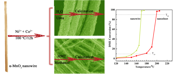 异质结构材料在催化或者电催化领域扮演重要的角色。发表在Inorganic Chemistry Frontiers的题为“Controllable synthesis 3D hierarchical structured MnO2@NiCo2O4and its morphology-dependent activity”文章(第一作者:孙明副教授,通讯作者余林教授),以氧化锰纳米线为基底,可控合成了两种形貌的异质复合材料,考察了形貌依赖的催化燃烧性能。