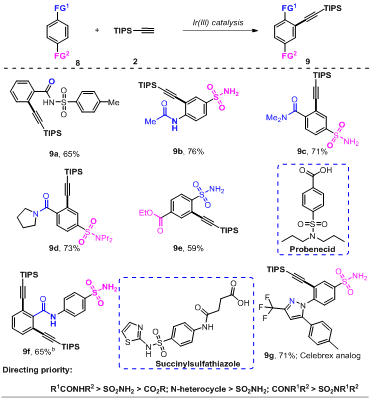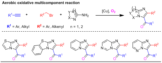 有机光电材料与功能高分子团队李先纬副教授和霍延平教授在过渡金属催化的有机合成取得重要进展。团队成员通过探索发现了廉价金属二价铜催化剂可以实现末端炔烃、苄基或烯丙基卤、2-氨基含氮杂环在氧气作为氧化剂的条件下快速构建咪唑并含氮杂环衍生物,该类化合物是很多药物分子包括唑吡坦、阿吡坦、沙立吡旦等抗炎药、中枢神经用药的核心骨架。最近还发现该类二杂环羰基化合物在发光材料领域也有较好的应用价值。此外,团队成员还在前期碳氢键的直接官能团化反应取得进展,研究发现在医药领域广泛存在的酰胺、一级磺酰胺类化合物可以在三价铱催化下实现区域选择性的炔基化反应。研究还进一步对一些药物分子包括塞来昔布、丙磺舒、磺胺杀定(一种治痢剂)进行了后期修饰,鉴于炔烃的多功能性,期待该类分子在新药开发中有潜在应用价值。相关研究成果先后发表在:Org. Biomol. Chem., 2018, 16, 7143–7151 (Front Cover Paper); Org. Chem. Front., DOI: 10.1039/c8qo01105b. (Front Cover Paper).