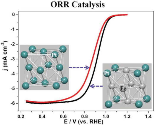 氢氧燃料电池是一种洁净高效、安全环保的新能源技术,燃料电池汽车是我国新能源汽车的重要发展方向。在国务院编制的《中国制造2025》规划细则中,明确提出了在2020年前扩大燃料电池汽车运行规模,实现5000辆的运行规模,到2030年,燃料电池汽车达到百万量级商业化的目标。当前各地政府针对各自的基础制定了相关的燃料电池发展规划。阴极氧还原反应是燃料电池的核心催化反应之一,因为ORR的动力学缓慢需要较高的铂载量,导致了燃料电池的高成本,从而制约燃料电池的商业化。传统降低Pt载量,提高Pt的利用率的方法是铂与过渡金属形成合金,但这些合金催化剂在耐久性和抗腐蚀方面存在缺陷,本论文通过构筑有序结构Fe3Pt金属间化合物,并协同金属氮化物载体共同作用,大大提高了催化剂的活性和稳定性,在0.9V电位下,该催化剂的质量活性高达673.5 mA mg-1Pt(是商业Pt/C催化剂的五倍),达到了美国能源部提出的2020年目标(440 mA mg-1Pt)。稳定性试验表明,改催化剂的耐久性要远高于无序结构的Fe3Pt/C和Pt/C催化剂。该工作对新型高效燃料电池电催化剂的设计和开发具有重要指导意义。