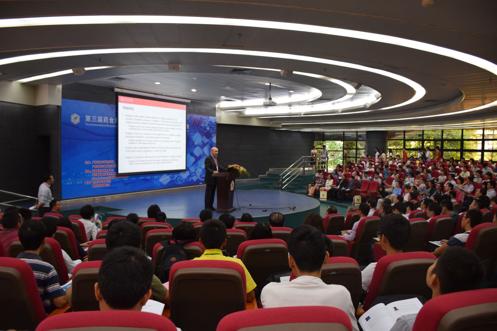 会议议程安排紧凑,开幕式上张力副校长、Rutgers大学副校长Chrisopher J. Molloy先生、广东药学会领导及会议赞助商中山完美公司领导依次致辞,随后迅速进入会议主题。13位专家代表先后做了精彩的大会报告,介绍了各自团队在药理、药化、中药化学、药食同源等多个方面的前沿工作,给在场的300多名与会代表开了一个学术盛宴。会议期间,大家还一起缅怀了为建立疯AV -Rutgers大学交流合作平台做出巨大贡献的Allan. H. Coney院士。