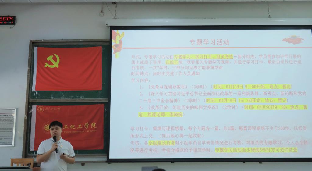 随后,轻化党建指导老师冯浩宸详细介绍了本届党校培训班的具体课程安排及注意事项。希望同学珍惜这次培训机会,迅速适应学习角色,以思维自觉点燃求知火种,秉深研精神牢固理论之本,将理论知识内化于心、外化于行,利用这次培训机会切实提升党性修养,争取早日成为一名真正的共产党员。