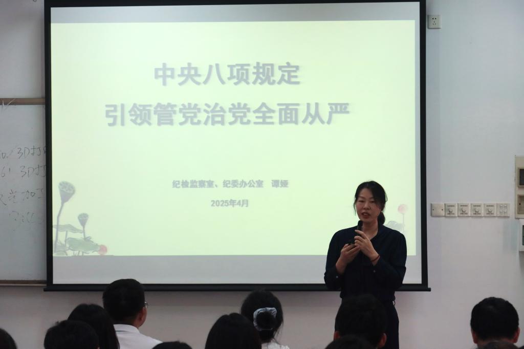 会上,谭娅主任围绕中央八项规定精神,结合丰富的案例,全面阐释了全面从严治党制度体系建设历程、违纪违法原因分析及党员干部如何加强廉洁自律。她首先系统阐述了全面从严治党制度体系的发展脉络。其次,她结合高校具体案例,重点剖析了在学术不规范、科研经费使用、公务接待等方面存在的违纪违法的问题及原因,她指出,违纪违法现象的产生主要源于三个方面:一是不上心、不了解、不掌握;二是麻痹大意,党性锻炼不足;三是自恃聪明,投机取巧,铤而走险。最后,她希望各位教职工党员一要强化学习,知纪明纪,对纪律有清晰地理解,确保对纪律要求有透彻地认识。二要不越红线,有界知止,确保在任何情境下都不越雷池一步。三要以案为鉴,利剑高悬,让警钟长鸣于心,以免重蹈覆辙。其深入浅出地讲解,使在场教职工对中央八项规定精神及习近平总书记关于加强党的作风建设的重要论述有了更为全面、深刻地认识,进一步增强了廉洁自律意识和守纪遵规自觉。