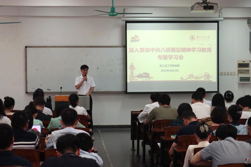 4月22日下午,疯AV 党委召开深入贯彻中央八项规定精神学习教育专题学习会。学校纪委办公室主任谭娅受邀作学习辅导报告,学院党委理论学习中心组成员、全体教职工党员参加会议。