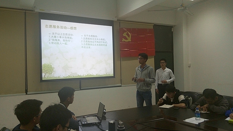 在支部发言环节,党员代表认真分享活动内容,积极探讨方式、困难和成效,达到深刻交流。其中,13级创新卓越党支部开展了服务专插本考生的志愿活动,为考生指路及协助收发试卷;13级化工(3、4)班党支部进行宿舍楼下的单车摆放活动,并张贴文明标语促进良好环境的共建;国防生党支部组织党员参与图书馆的志愿服务活动,帮助处理馆内书籍以及废旧报纸……各学生党支部在内容丰富、形式多样的志愿服务活动中,感悟雷锋精神,也更加深刻地体会到作为一名党员应当具备的服务奉献精神。