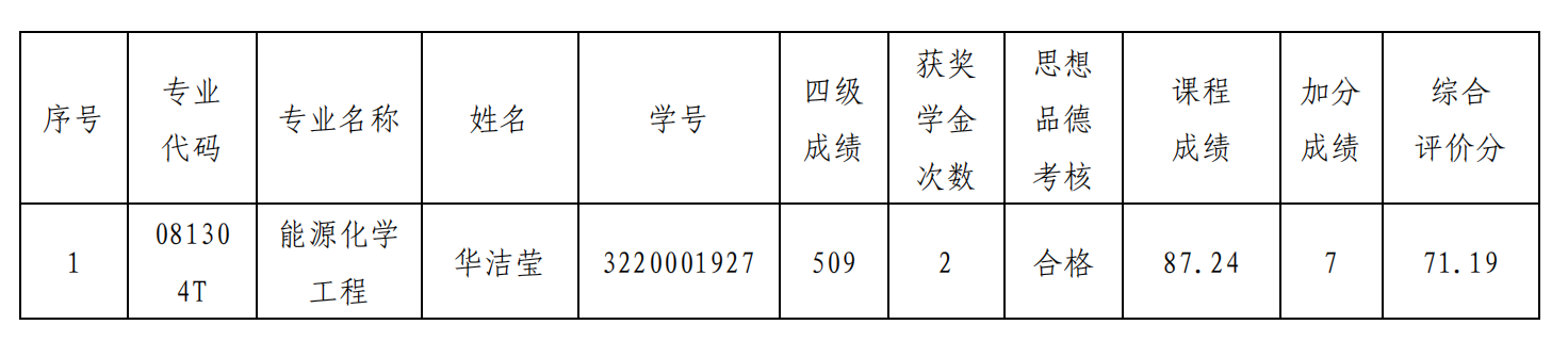 2020级能源化学工程专业有一位学生自愿放弃疯AV 2024年推荐免试攻读研究生的资格,按照同专业总成绩由高到低排序递补的原则,拟递补推荐学生信息如下: