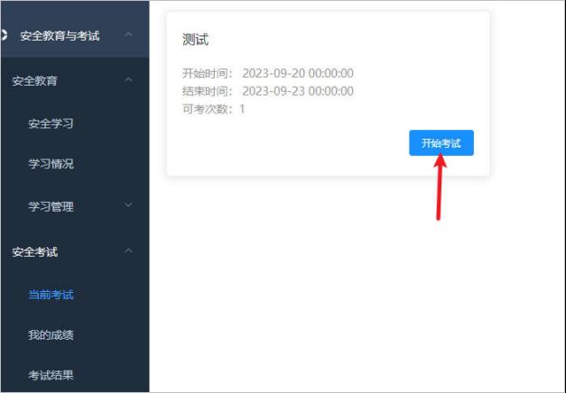 完成学习后,在“安全考试”—“当前考试”中找到对应的试卷,点击“开始试”进行考试(注意:未完成安全学习任务前,无法看到当前考试内容,必须先完成学习任务后才能考试,切忌同时打开多个学习窗口,否则学习完成也看不到试卷)。