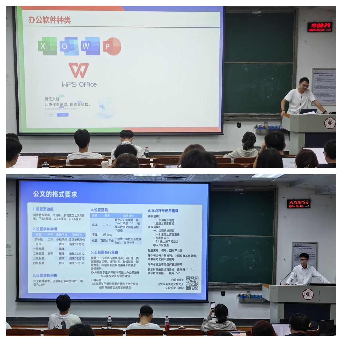 学生会主席团成员陈京豪同学开展“轻苗化才”学生骨干培训营第四期培训:办公软件运用及公文写作技能分享。何文杰同学从字体字号、图片、排版、数据处理等方面详细讲解了Word、Excel、PPT三个常用办公软件的基础使用方法和使用技巧,强调PPT制作中注意图文结合、不可过分依赖模板、切忌过分炫技,希望学生骨干们在工作中学习,在学习中成长,提升个人综合素质能力。陈京豪同学从演讲稿、工作报告、新闻稿三种常见公文分类出发,详细介绍文章结构、写作风格,强调建立搜索意识、提升搜索精准度、学习上级文件、研读兄弟单位材料、深挖本组织资料、整理批注意见等六点公文写作学习技巧,并通过实际写作案例具体分析常见问题。