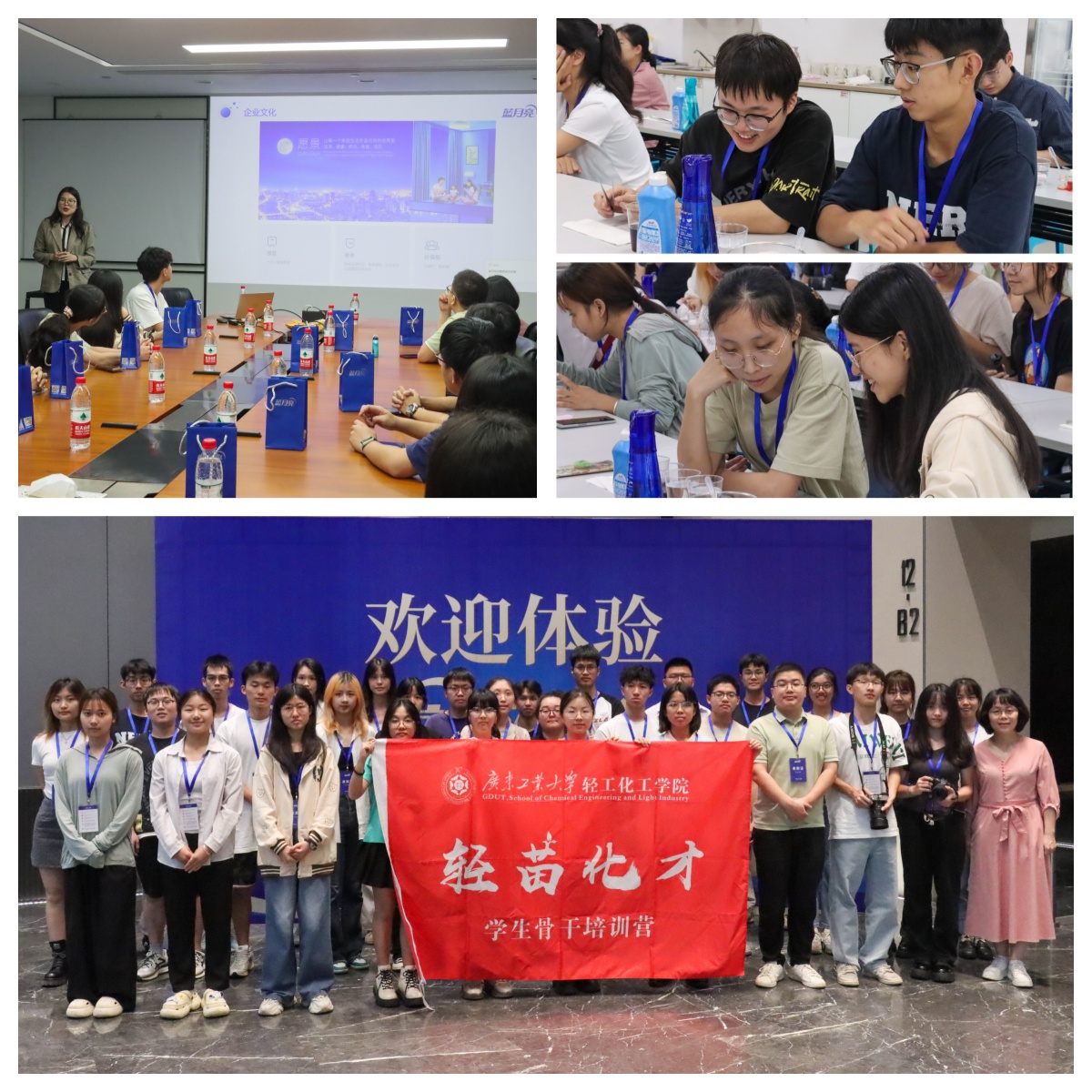 2024年5月23日,32名“轻苗化才”学生骨干培训营成员一同前往蓝月亮有限公司月亮大厦开展参观交流活动。在参观过程中,蓝月亮人力资源部主管鲍凌莎从企业地理位置、发展背景、市场地位、组织架构、员工待遇等多个方面详细介绍公司现阶段发展状况及未来发展目标。随后组织学生参观企业的主营产品,就产品的研发、生产以及销售的各个流程进行交流和讲解。