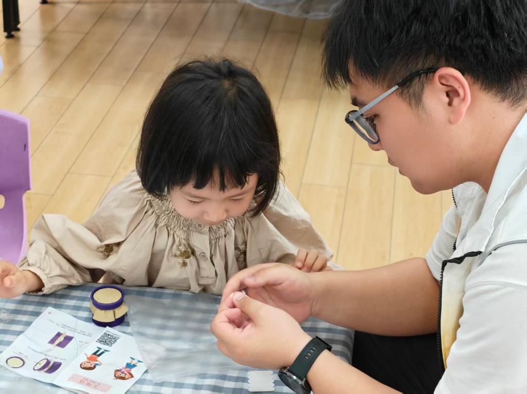 课程后半段,小朋友们亲手组装土电话,沉浸式体验“固体传声”的奥秘。12名志愿者化身专业科学助手,全程陪伴助力实验顺利开展。他们耐心指导小朋友粘贴牛皮纸,反复提醒大家用牙签穿孔时注意避免扎手,在细致的引导与贴心的叮嘱下,每位小朋友都成功通过自制土电话听到了同伴的声音。一声声欢呼,是实践探索后的由衷喜悦,是对科学魅力的真切赞叹,更是对这堂科普课最真挚的褒奖。