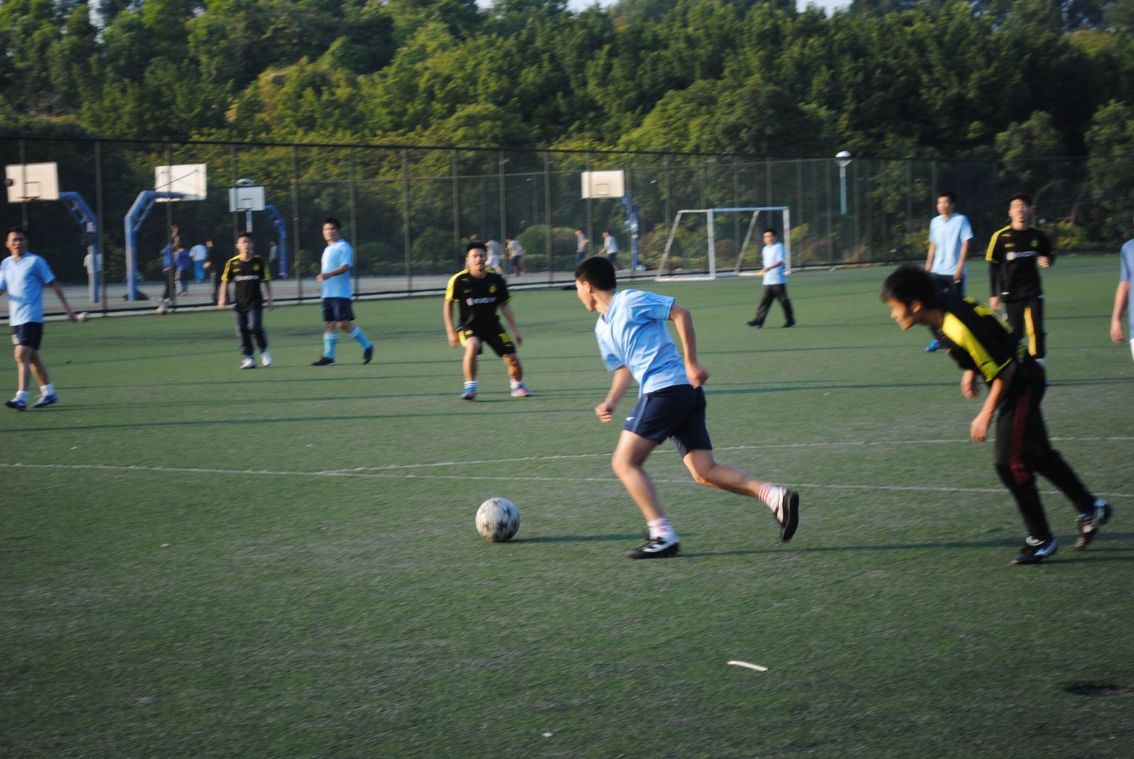 伴随着裁判一声哨响,激烈的比赛拉开了序幕。赛场上,双方各有优势,研究生队一开场即凭借速度的优势,首入一球。随着时间的推移,双方球员渐入佳境,比赛开始激烈起来,教工队凭借丰富的经验不时打出精妙的配合和有威胁的射门,教工队一记进球把比分追平。比赛过程中双方各不相让,进攻、防守,你来我往,精彩纷呈。场外学生也激情洋溢,纵情地为队员们加油、叫好,现场气氛十分热烈。师生间的隔阂在场上已荡然无存,有的只是飞扬的步伐、矫健的身姿和师生间如朋友般的浓浓情谊。最终教工队凭借经验与配合以5:3的比分赢得了比赛。