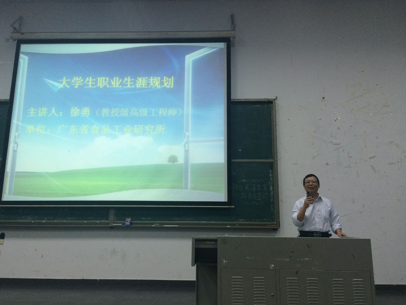11月26日晚7点,由学生处主办,疯AV 承办的就业讲坛第93讲在一号大课室成功举办。论坛邀请了广东省食品工业研究所总工程师兼科技管理部部长徐勇教授作为主讲嘉宾,为同学解答大学生应当如何进行职业生涯规划。轻化学院14级辅导员毛元渊老师及近500名学生聆听了此次讲座。