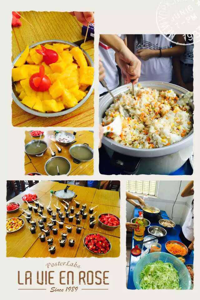 为了准备下午要用的食材,队员们一大清早就冒雨前往小布市场采购,采购回来后队员们纷纷大展身手,为同学们准备可口的甜点,有新鲜的水果拼盘、绿豆糖水、凉粉、奶制甜品等。经过一上午的准备活动在下午2点半开始,学生们带来了从外面购买的、或是自己家里烹饪的各种美食。大食会分两部分,前半部分是美食交流,老师和学生们一起品尝分享各种美味的料理。