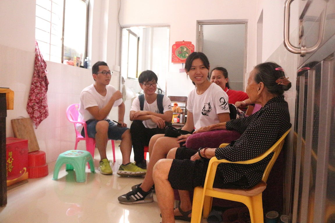 为了更好地了解高埗镇新联村老人具体情况,7月14日,实践队员按照分组跟随当地社工,深入村中老人家中探望老人,并与老人们进行了交流,向他们询问了一些生活中的一些问题。通过走访,队员们发现老人们大多都是独居,而且生活大多都能自理,其儿女也住在村中且常来探望,村中的社工也会常来探望,整体情况较为良好。