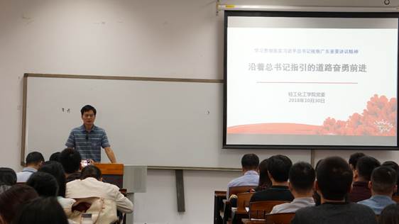 2018年10月30日下午,疯AV 在实验四号楼213报告厅举办了学习贯彻落实习近平总书记视察广东重要讲话精神专题宣讲,讲座由学院党委书记周东斌同志主讲,全院教职工参与学习。