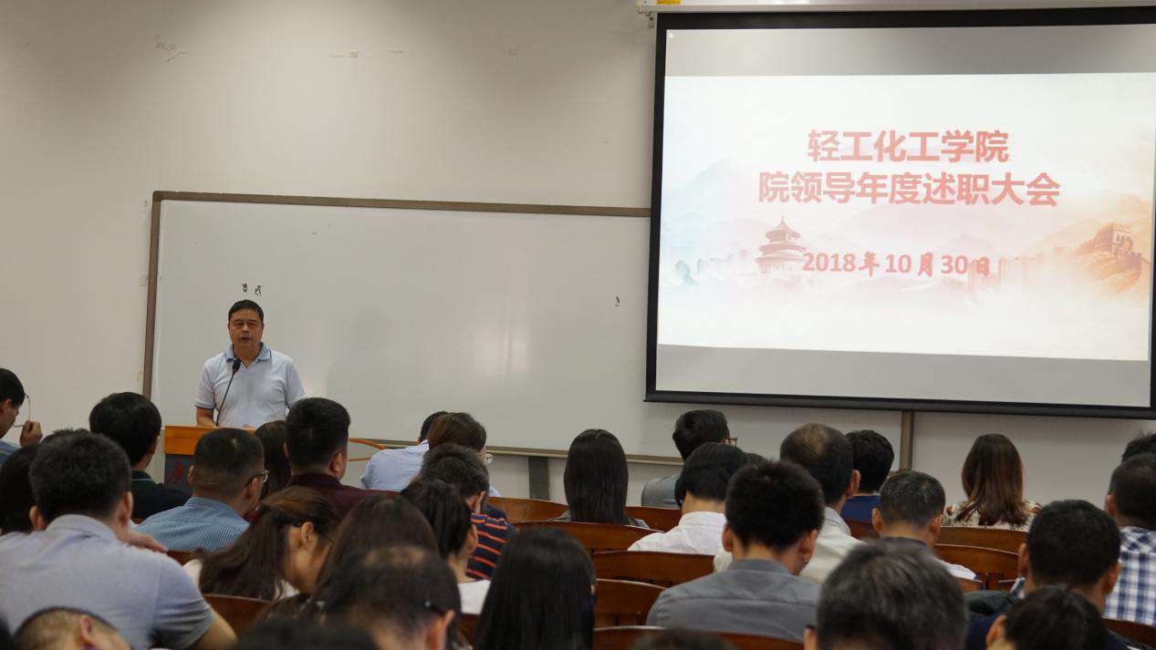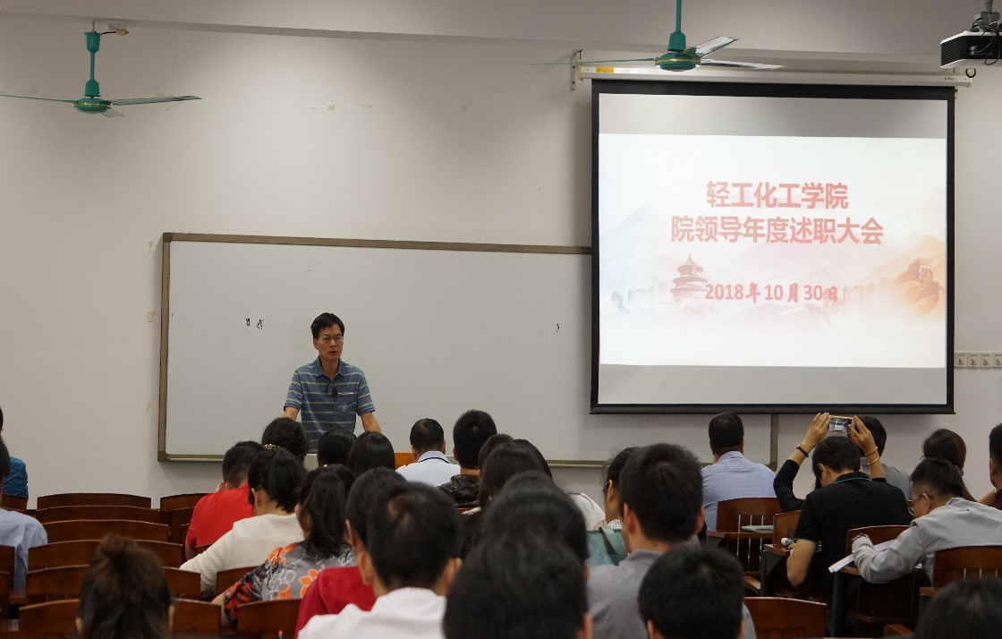 在实验四号楼213召开关于全院大会,学院领导班子参加了此次会议并依次进行个人述职。