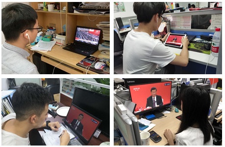 大会伊始,伴随着直播里李希同志宣布大会开始,全体师生代表起立奏唱国歌。随后,老师、同学们认真聆听广东省委副书记、深圳市委书记王伟中,研祥高科技控股集团有限公司董事局主席陈志列,中建科工集团有限公司华南大区总工程师陆建新同志的发言,中共中央总书记、国家主席、中央军委主席习近平的重要讲话。