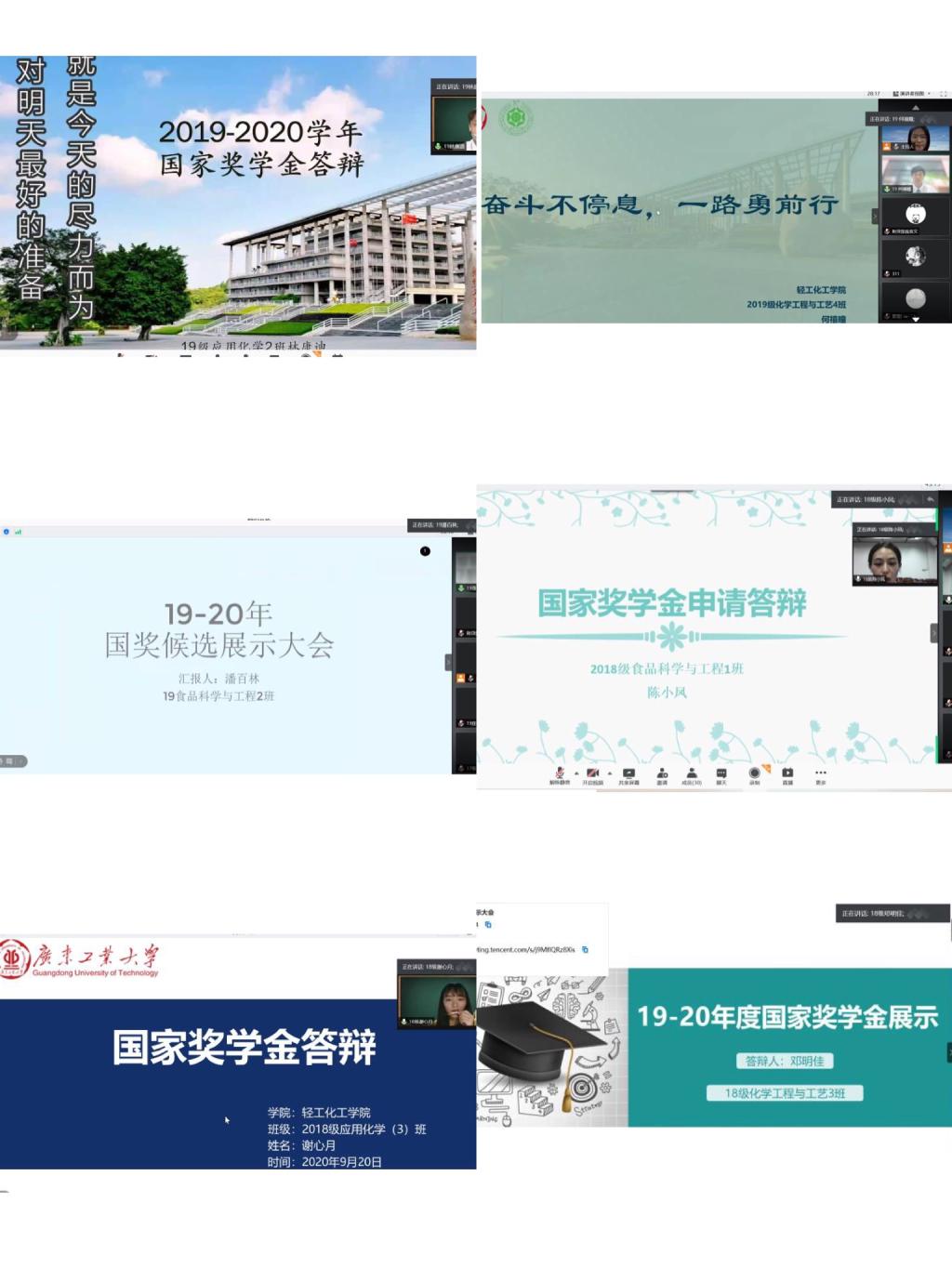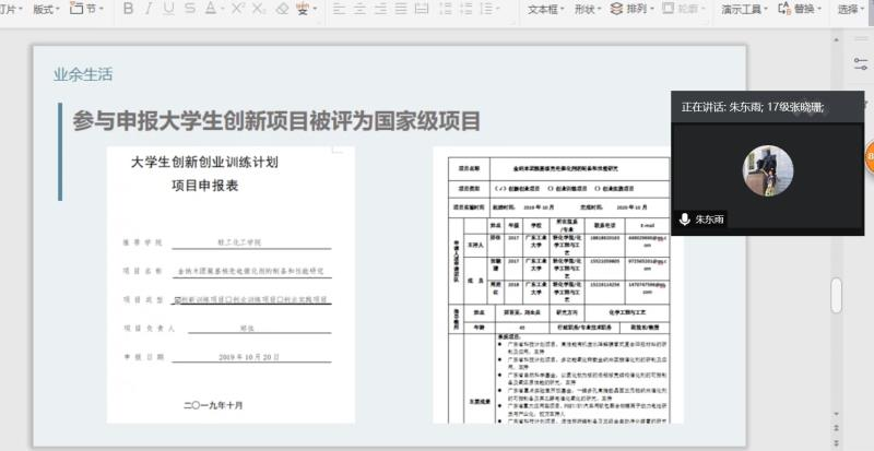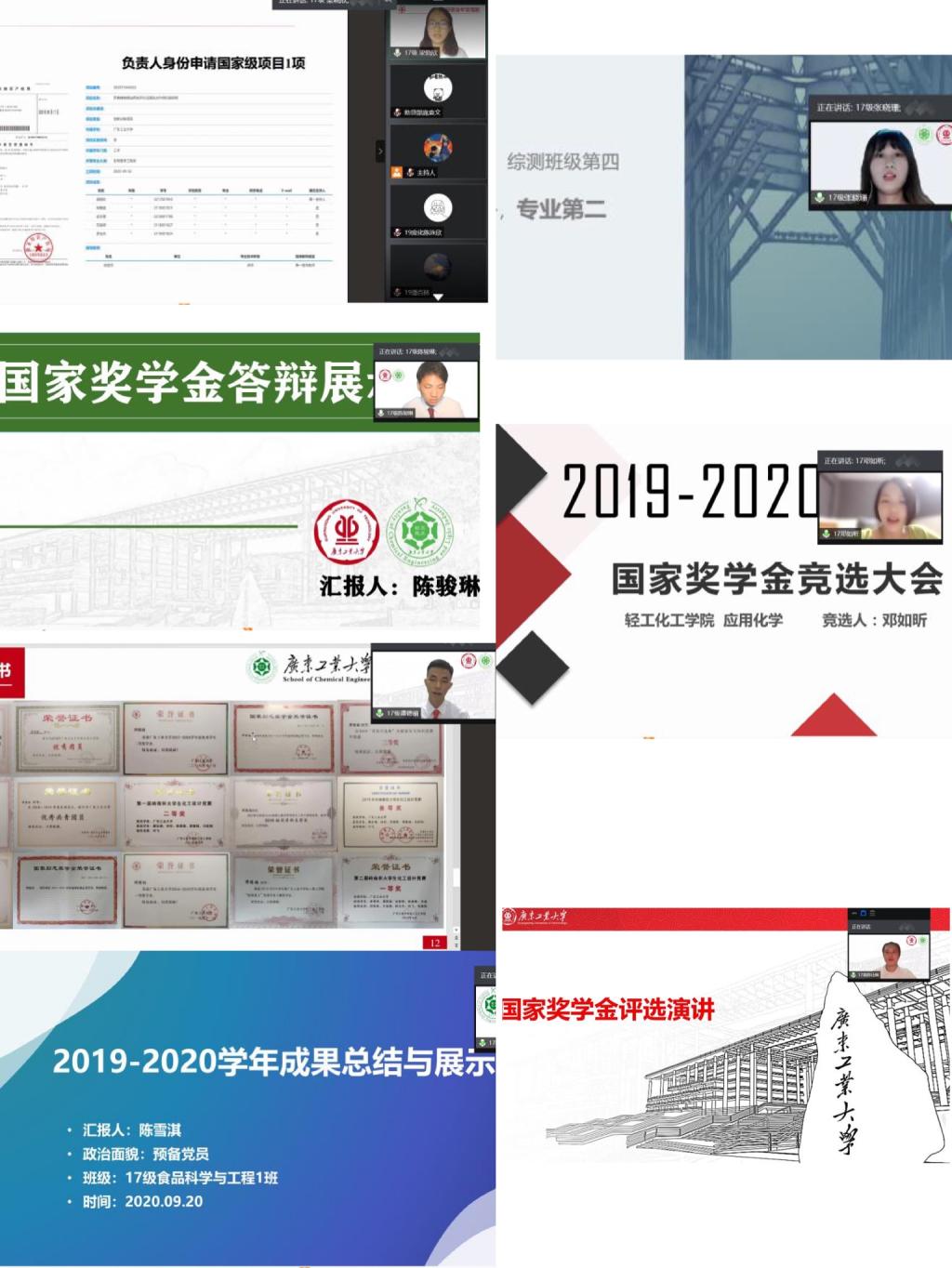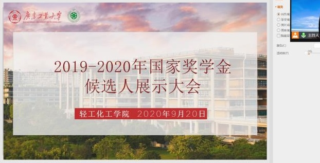 2020年度全日制本科生国奖奖学金候选人展示大会。采用线上腾讯会议展示、腾讯课堂转播的形式。会议出席嘉宾有学院党委副书记邱伟青,评审工作小组由化学工程与工艺系主任朱东雨老师、各年级辅导员和优秀学生代表组成,13位国奖候选人参与展示。本次会议由辅导员吴佳澄主持。