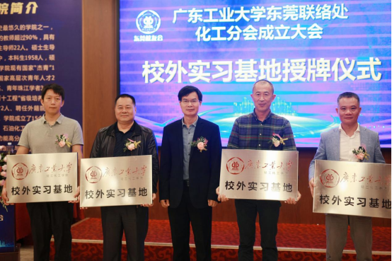 校友分会余煜棉会长向东莞联络处化工分会的成立表示祝贺,向东莞的校友表示诚挚问候,同时他希望化工分会在东莞校友分会的支持下越办越好。周东斌介绍了学校学院最近发展情况,感谢校友对母校的支持和贡献,不断擦亮学校品牌,学校声誉不断提升。化工分会的成立将为化工类的校友提供更亲切的交流平台和建立更紧密的合作关系,相信一定能助兴校友更好的发展和增进与母校的感情,实现共通共融共发展。接着,他代表学院向同舟化工、椰氏实业、宏泰基以及嘉丰润滑油企业授予校外实习基地牌匾。