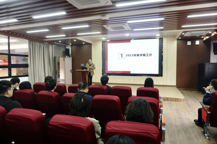 学院党委书记周东斌首先介绍了新入职的教师,简要总结了学院过去一年的工作和取得的成绩,并感谢全体教职工的辛勤付出。随后,他围绕高质量党建引领学院高质量发展主题作本学期学院党委主要工作部署。他指出,2023年我省发展将进入高质量发展的关键期,疯AV 全体教职工要坚定不移贯彻落实党的二十大精神,扎实落实全省高质量发展大会精神,以学校高质量发展助推广东省实现现代化建设新的跨越,并提出五点期望:一是要学习贯彻党的二十大精神和广东省高质量发展大会精神及学校工作部署,扎实推进高质量党建引领高质量学院发展;二是加强纪律作风建设,为高质量学院发展提供保障;三是加强政治与意识形态及校园的各项安全工作,为平安校园筑牢安全防线;四是健全完善高质量党建引领学院高质量发展的工作机制,推动学校“1+2+3”攀撑计划学科提升工程;五是加强校友联系,做好庆祝本科办学65周年工作。