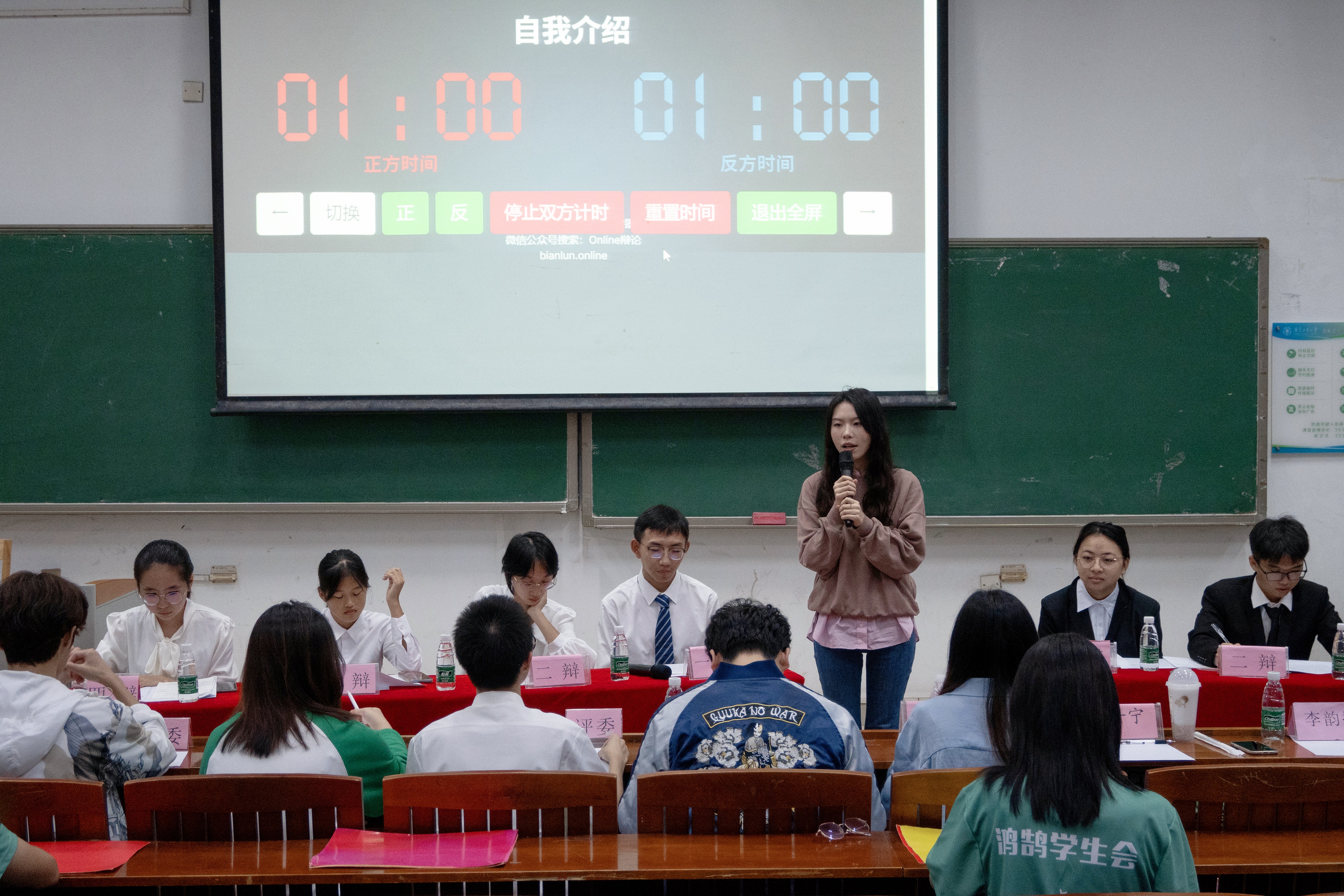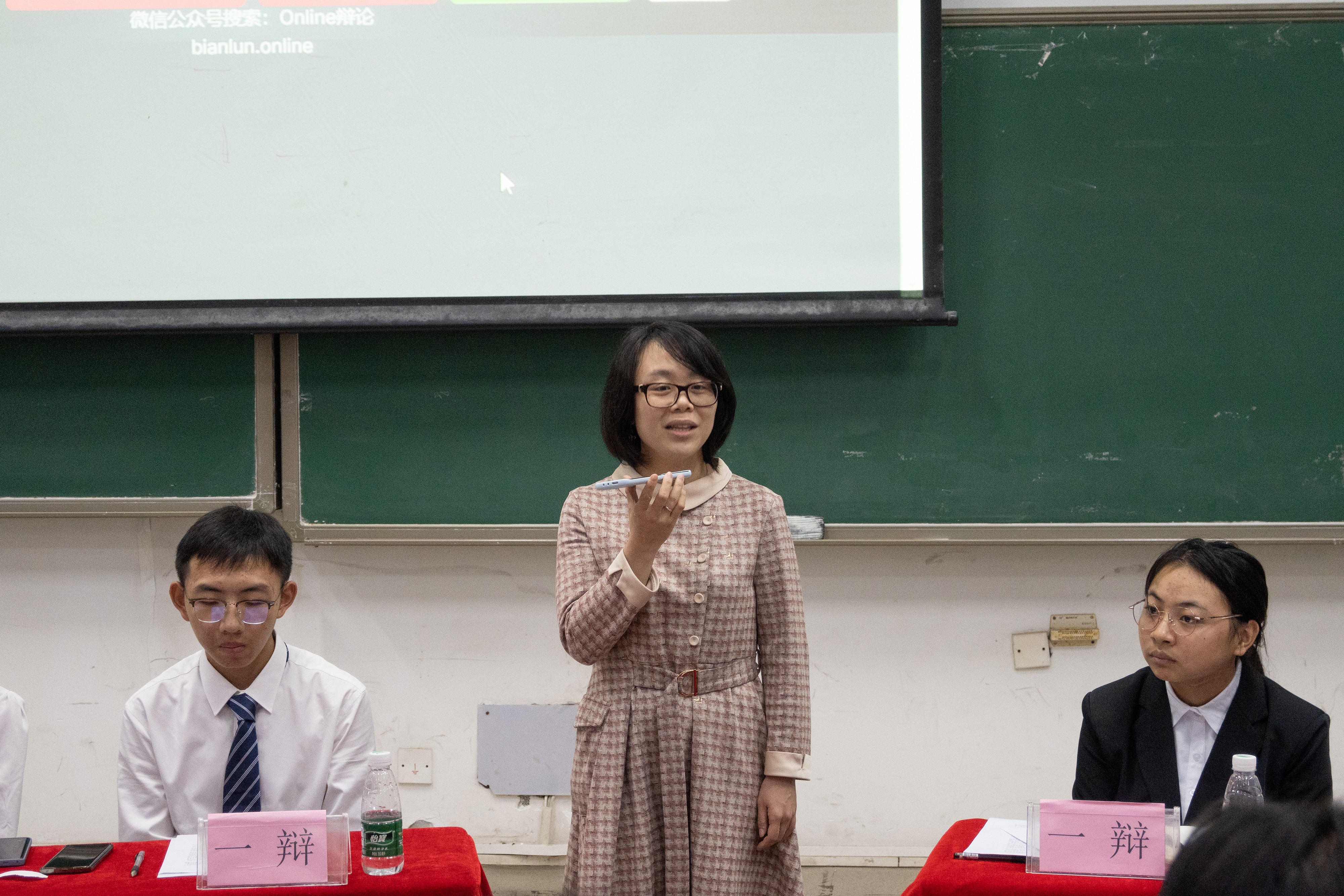 特开展“新生杯”辩论赛。在遵守疫情防控规定的前提下,各班代表队唇枪舌战,激烈角逐,最终有四支队伍晋级半决赛、决赛。因疫情防控需要,11月25日晚半决赛、决赛采取评委选手在线下,观众在线上的形式开展。学院21级辅导员李韵捷、学院团委副书记林沛、学院团委副书记兼学生会秘书长徐丹宁,评委、各参赛选手共10余名师生到教学四号楼204参与本次活动,线上观众达133人。