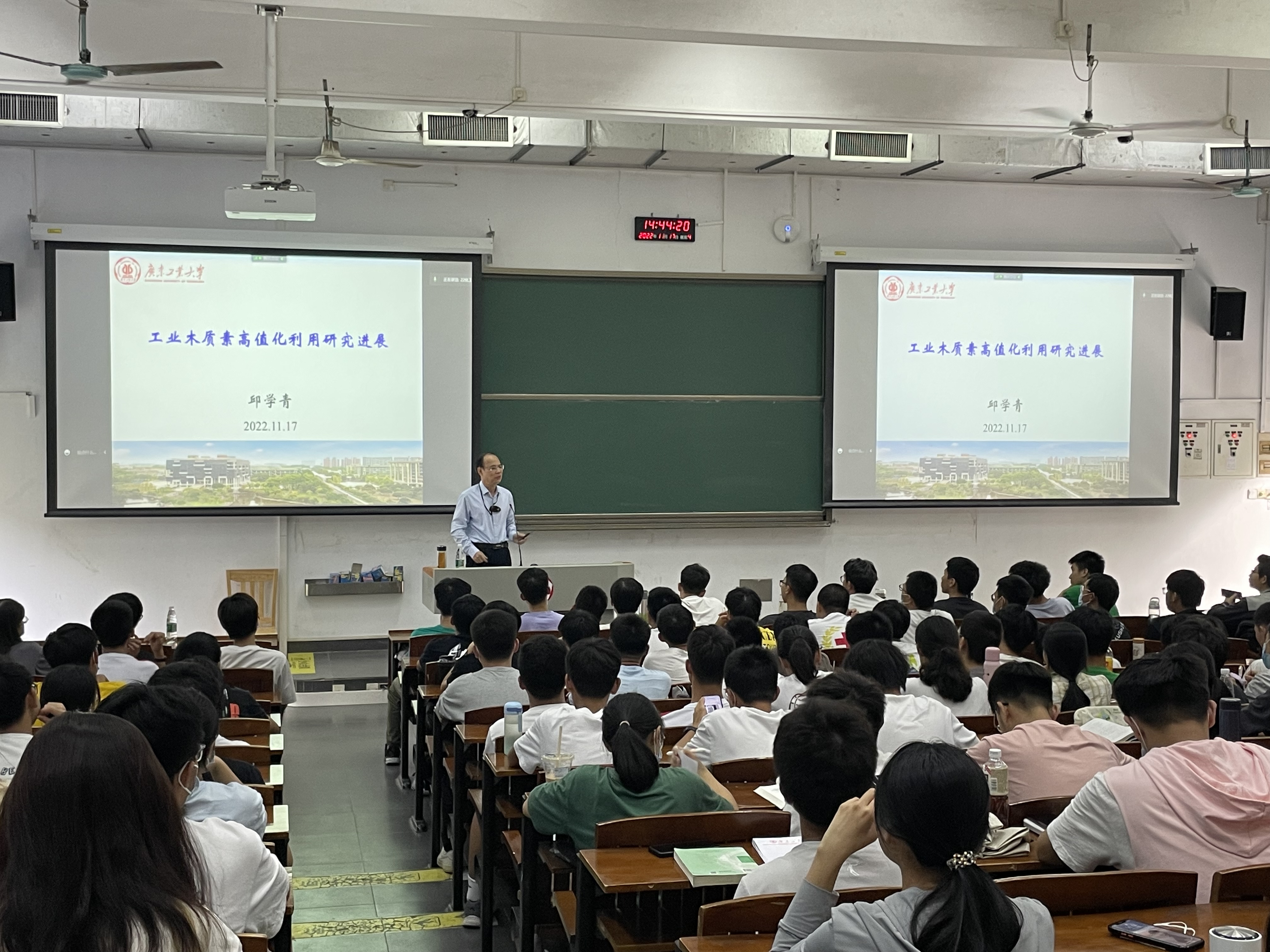 校长邱学青教授在百忙之中为大学城校区化学工程与工艺专业2022级近200名新生带来了题为《工业木质素高值化利用研究进展》的专业导论课。能够有机会聆听校长为大家讲述专业导论课,同学们既兴奋又期待。