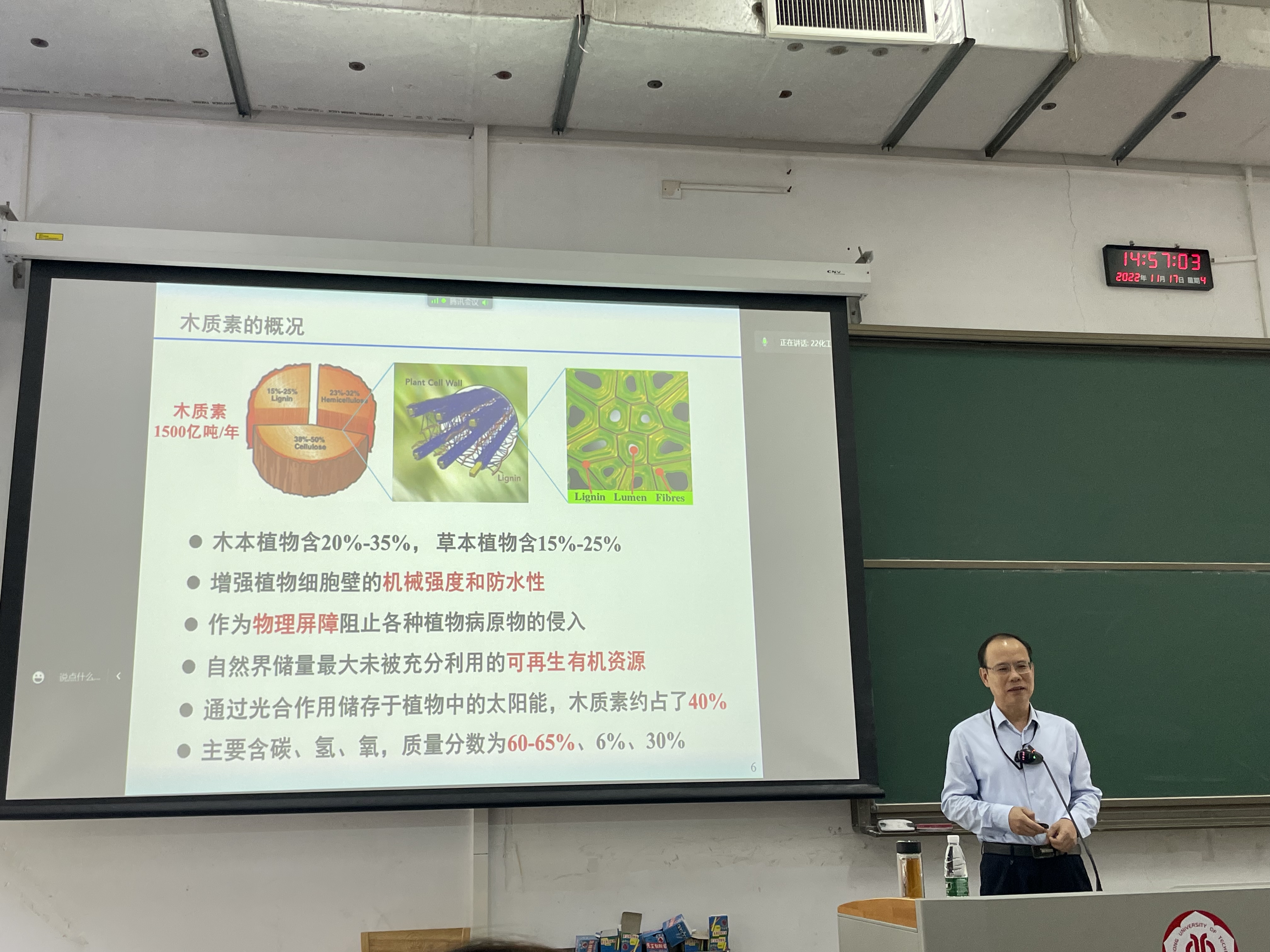 随后,“邱老师”循序渐进、深入浅出地为新生们介绍了工业木质素高值化利用的研究背景与现状,通过分子设计、改性反应、溶液微结构调控等方面介绍了其课题组二十多年来在工业木质素产品技术开发与应用的成果,包括木质素基工业表面活性剂、纳米功能材料、炭材料、高级燃料等。邱校长鼓励同学们主动思考、敢于寻根问底,充分利用网上和图书馆资源随时学习,鼓励同学们早日进入科研实验室学习训练。