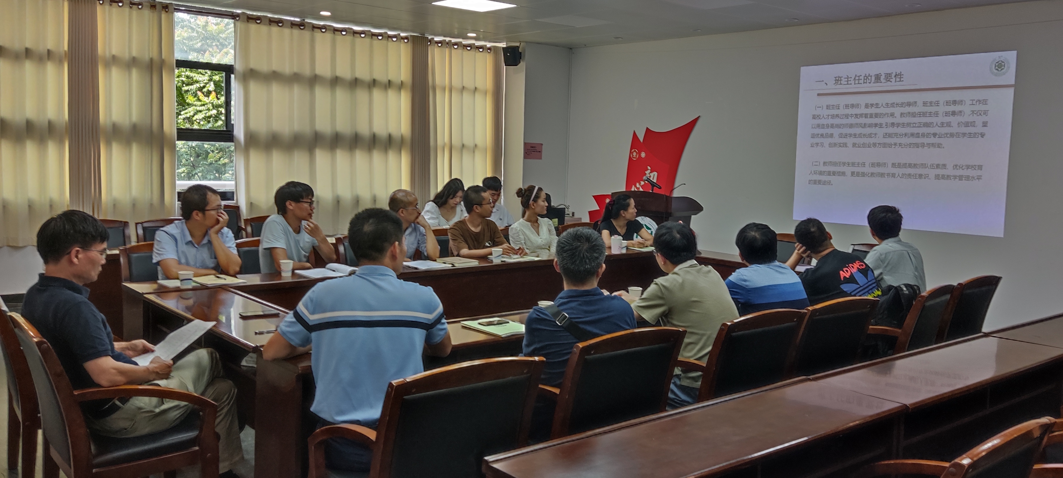 为促进与班主任的沟通协作、共同助力新生成长成才,831日下午,学院召开2022级新生班主任会议。学院党委书记周东斌对老师们主动担任班主任表示肯定和欢迎,就“什么是班主任”和“怎样做好班主任”两方面向班主任提出四点要求:一是要以立德树人为根本,围绕学生、关照学生、服务学生,了解学生思想行为特点;二是要用习近平新时代中国特色社会主义思想铸魂育人,旗帜鲜明讲政治,帮助青年辨明方向、校准航向;三是要发挥榜样作用,做学生成长成才路上的引路人,为学生点亮理想的灯、照亮前行的路;四是多与辅导员沟通交流,形成育人合力,提升育人效果,更好地落实立德树人根本任务。学院党委副书记杨刚为大家介绍了班主任的重要性、工作职责、考核要求和保障激励办法等,分享了点线面结合抓好班级建设等工作建议。新生辅导员介绍了迎新、入学教育和军训等工作安排和注意事项。