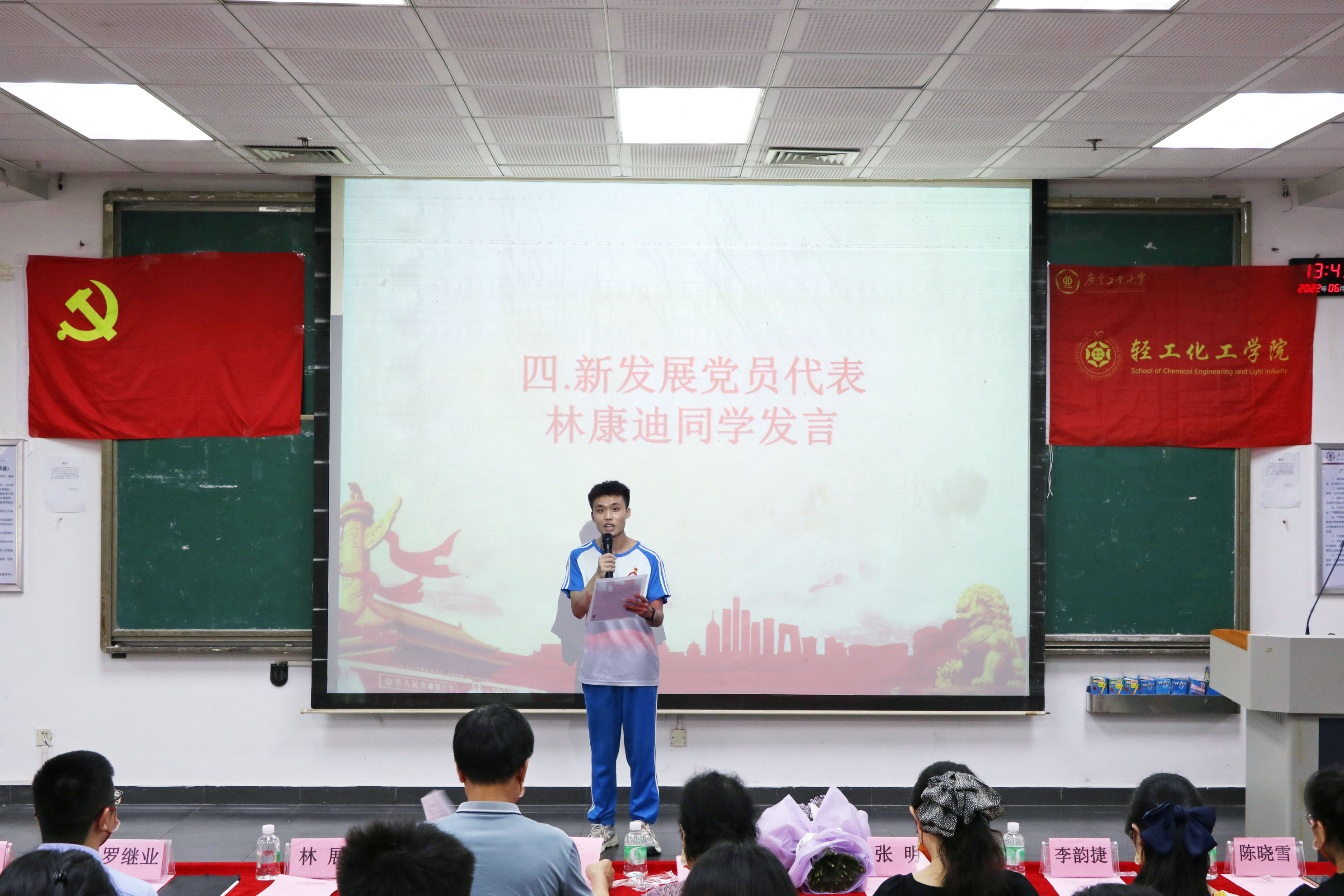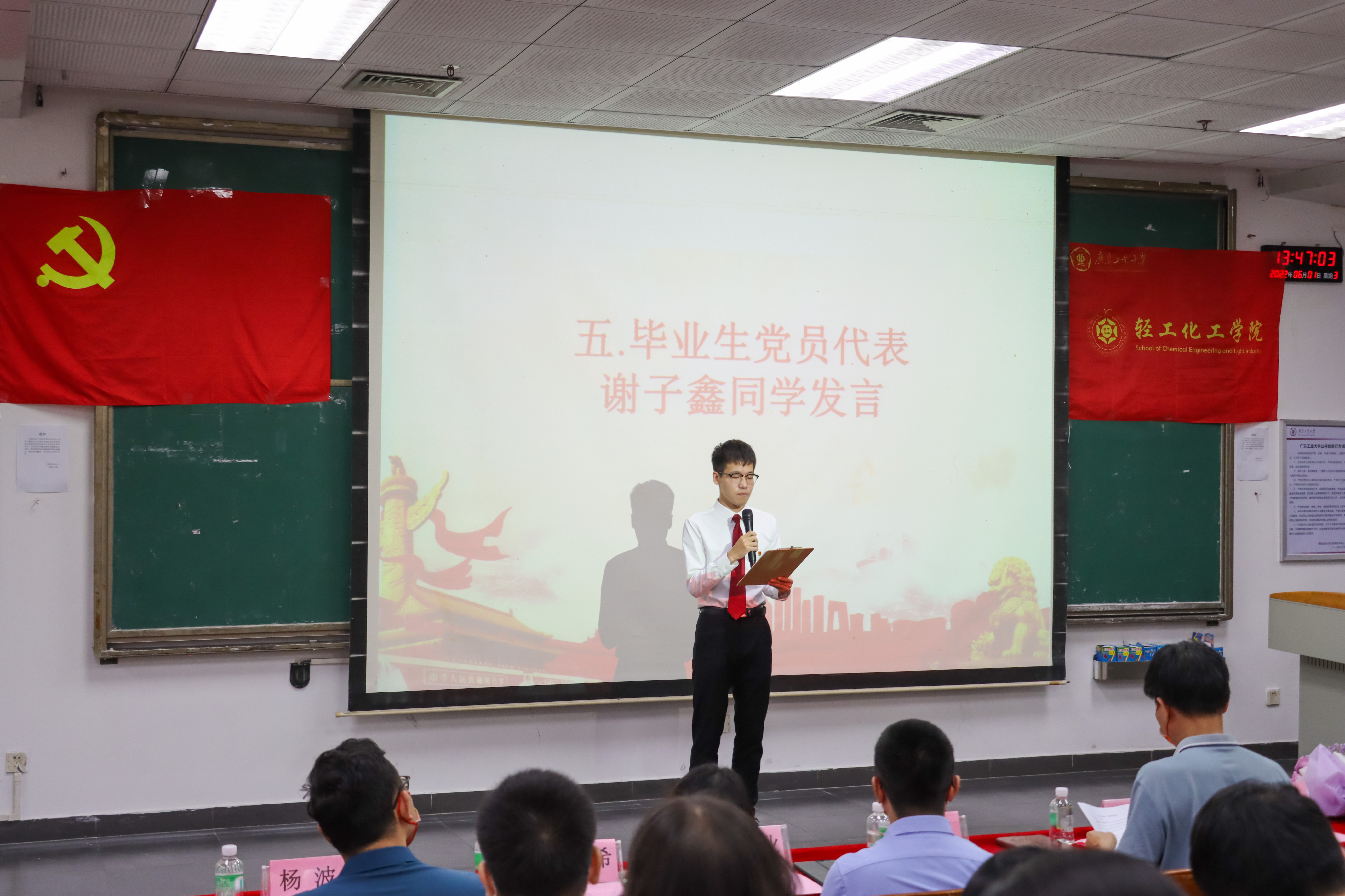 会议在庄重肃穆的国歌中拉开帷幕。随后,在黎碧娜老师的领誓和周东斌老师的监誓下,全体党员面向党旗庄严宣誓,铿锵有力的誓言让每一位党员坚定了初心使命,强化了责任担当。接着学院领导和各学生党支部书记分别为新发展的党员佩戴党徽,这种以老带新、薪火相传的‘老党员’为‘新党员’佩戴党徽仪式,是一种鞭策,也是一种激励;是一种精神的传承,也是一种奋斗的延续。通过这种“仪式感”使全体党员在亮明身份的同时,增强了党性观念和党员意识;牢记了党员的政治责任和历史使命。然后新发展党员代表和毕业生党员代表分别发言,两位同学通过讲述自身的入党初心,号召同学们在日常学习和工作中,时刻牢记党员身份,积极发挥党员先锋模范带头作用。