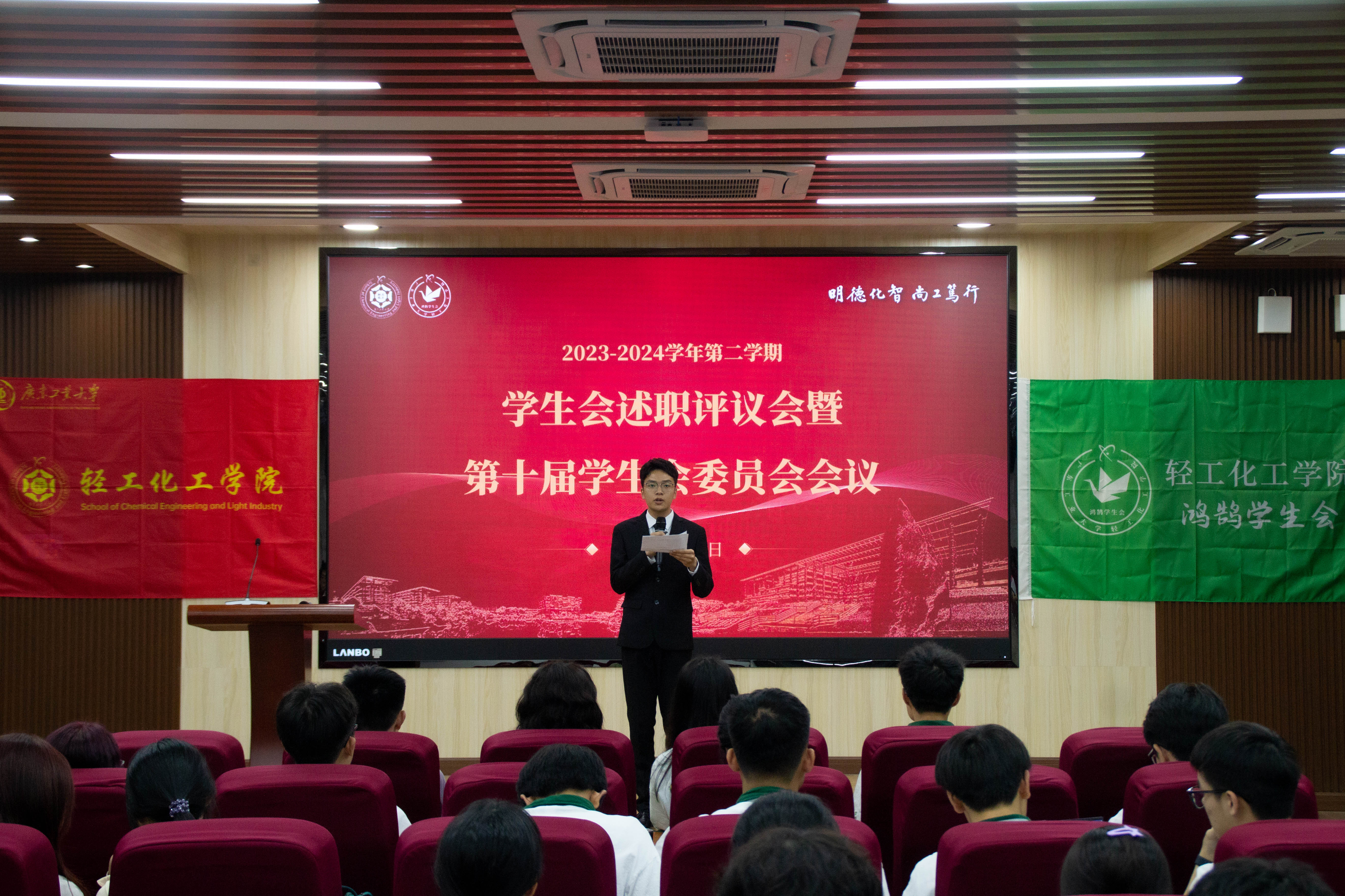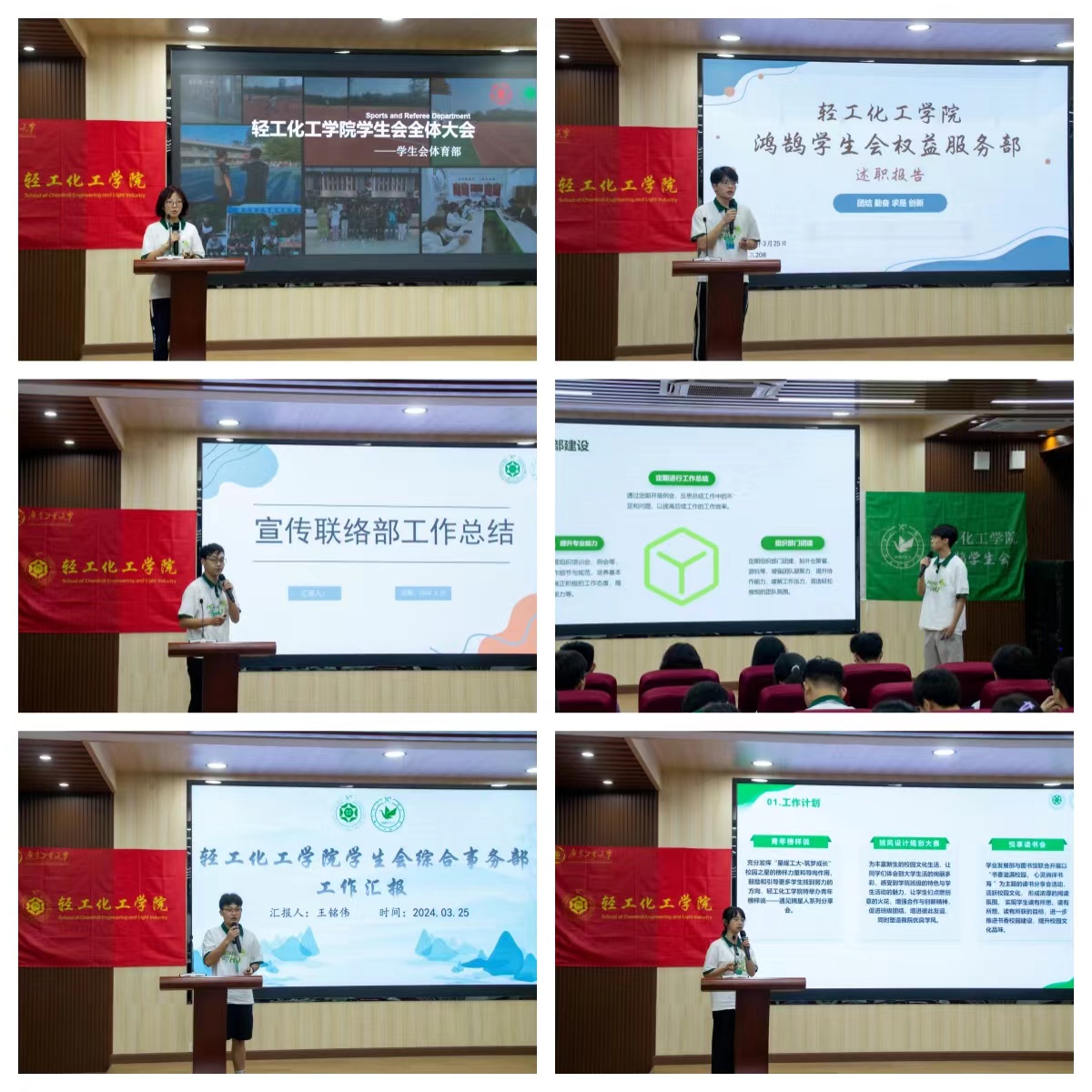 会议伊始,学生会体育部、权益服务部、宣传联络部、文娱部、综合事务部、学业发展部依次述职,向大家梳理各类活动已取得的成果,并结合本学期的特色项目,从工作重心、活动形式、团队建设等方面详细地汇报本学期的工作计划,如“四球”班级联赛、毕业晚会、青年榜样说——遇见摘星人系列分享会、十大提案、班风设计规划大赛、翻阅前辈“人生的书”、解忧杂货铺、鸿鹄仔社区值班服务等活动的进展,强调坚持全心全意为同学服务的工作宗旨。