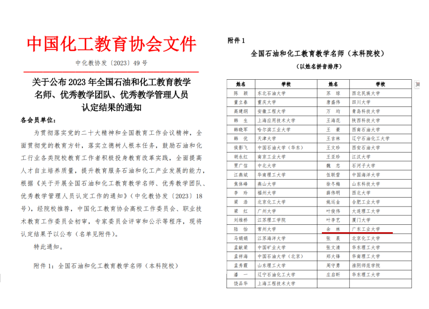 近日,中国化工教育协会公布了2023年全国石油和化工教育教学名师、优秀教学团队的认定名单,疯AV 余林教授荣获2023年“全国石油和化工教育教学名师” 荣誉称号。