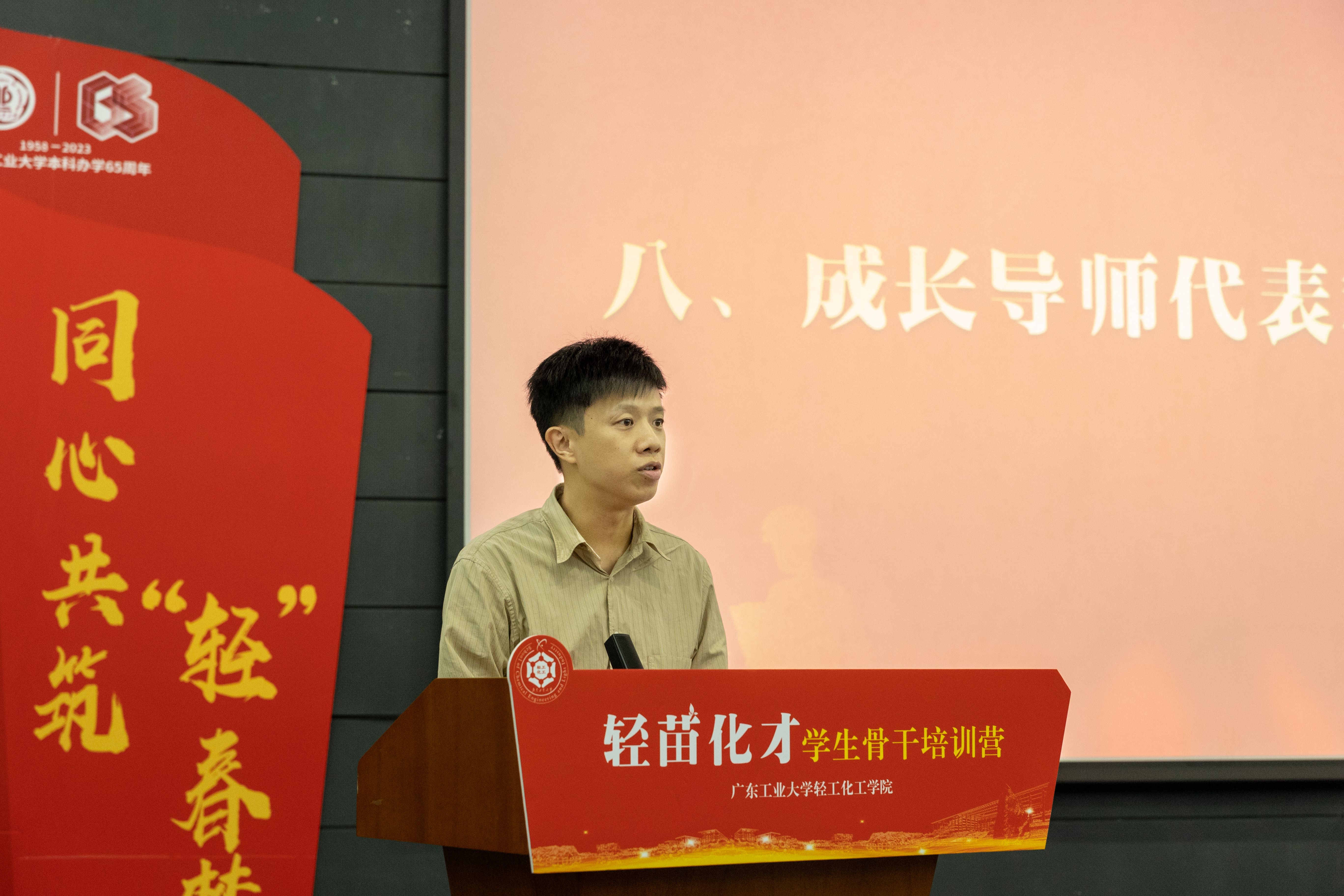 成长导师代表程高老师表示自己不仅就读于广工,任职于广工,现在也可以通过担任“成长导师”,用自身的学识和经验反哺学校。他以本科期间丰富的学生工作经验分享了作为学生骨干必备四点的素养:善于管理实践、善于沟通表达、善于团队合作、善于调整心态。同时计划通过分享自己学生工作中的经历和教训,帮助学生骨干树立正确的工作观念,指导和协助其制定学习工作计划。他希望在“轻苗化才”培训营,不仅可以作为一名老师,同时也可以作为一位学生,与大家一起互相学习,互相提高,不断追求卓越,成为更好的自己。