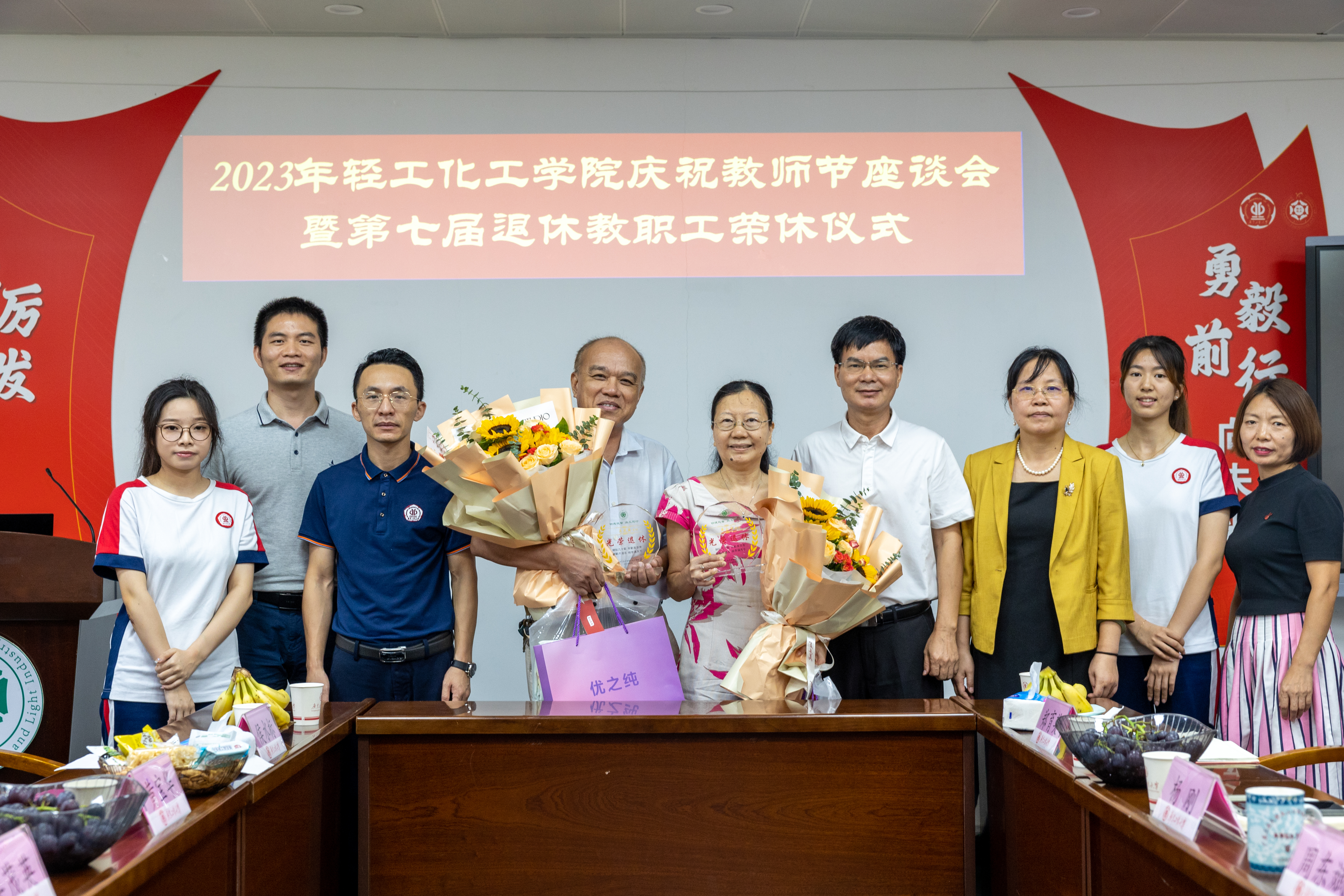 接着,学院为近一年退休的四位教职工举行了光荣退休仪式,感谢他们几十年如一日奋斗在教学科研一线,辛勤耕耘,默默奉献,他们用最珍贵的青春芳华和激情汗水书写了在轻化学院的精彩职业生涯。退休教师代表黄宝华教授和吴茂英教授对于学院精心举办的荣休仪式表示了感谢,和大家一起回顾了他们求学和工作的心路历程,感慨学院学校发展之快,为学院取得的成果深感自豪,同时也为学院的未来发展充满无限期许!