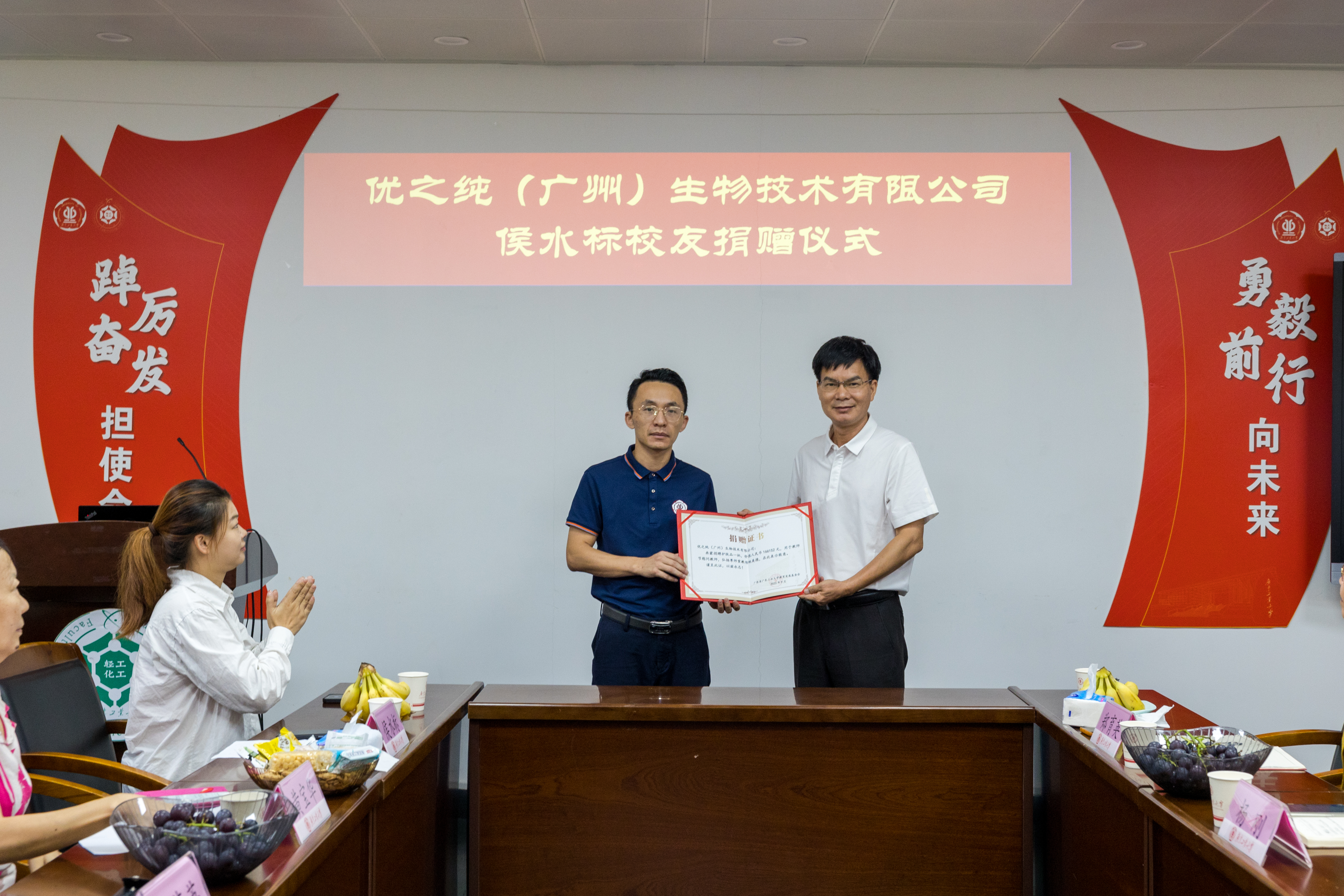 会前,疯AV 2008届校友、优之纯(广州)生物技术有限公司创始人候水标先生向学院捐赠了一批护肤品,以表达对老师和学院的感恩和祝福。活动中设置了校友捐赠仪式环节,周东斌书记代表学院向候水标校友颁发捐赠证书。侯校友在讲话中,分享了自己从轻化学院毕业后经过多年努力成功创建自己的化妆品品牌的成长历程,回忆了在校求学期间老师们对他的关心、培养和鼓励,由衷地表达了自己对母校的感谢和对老师们的感恩。