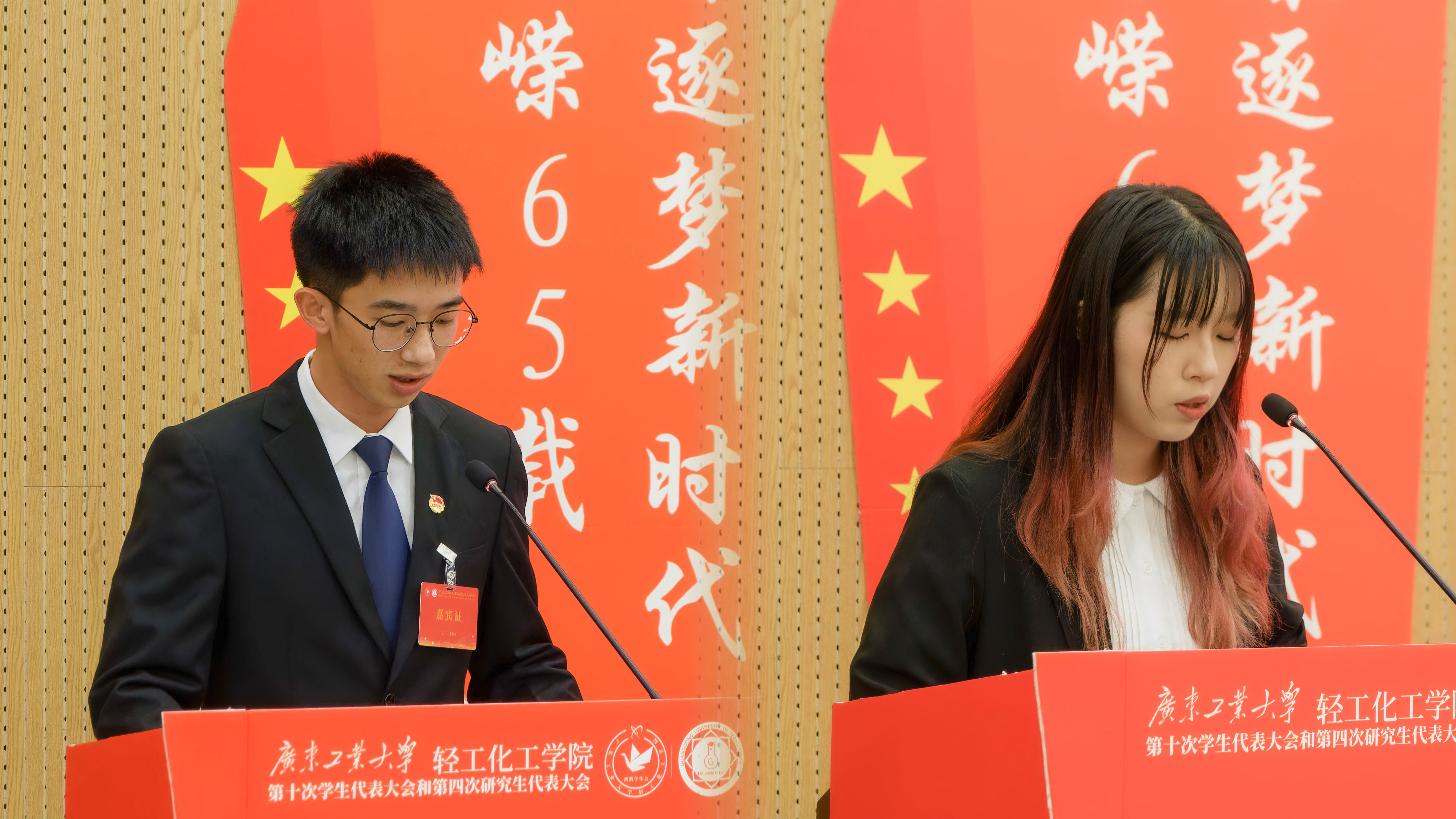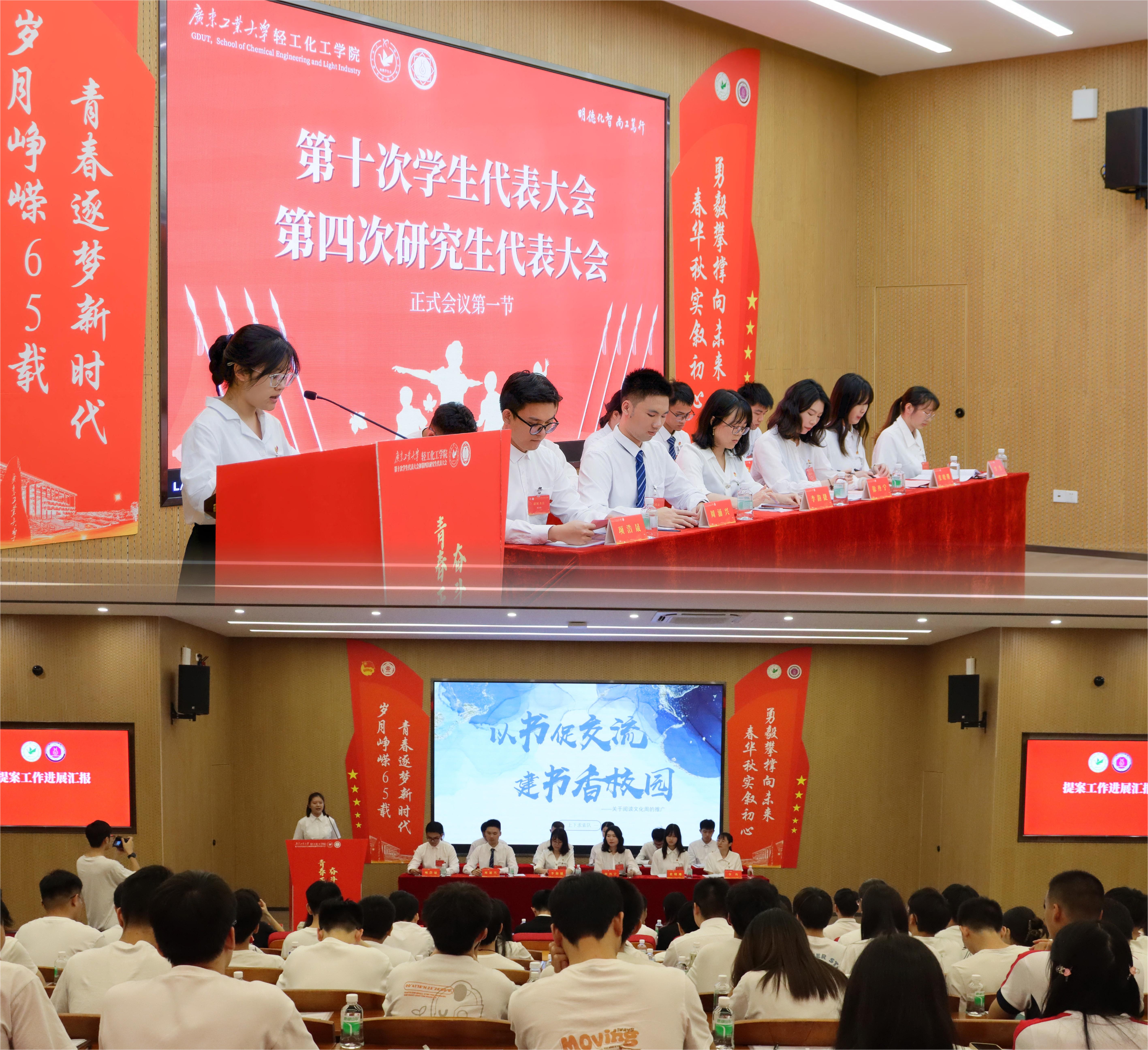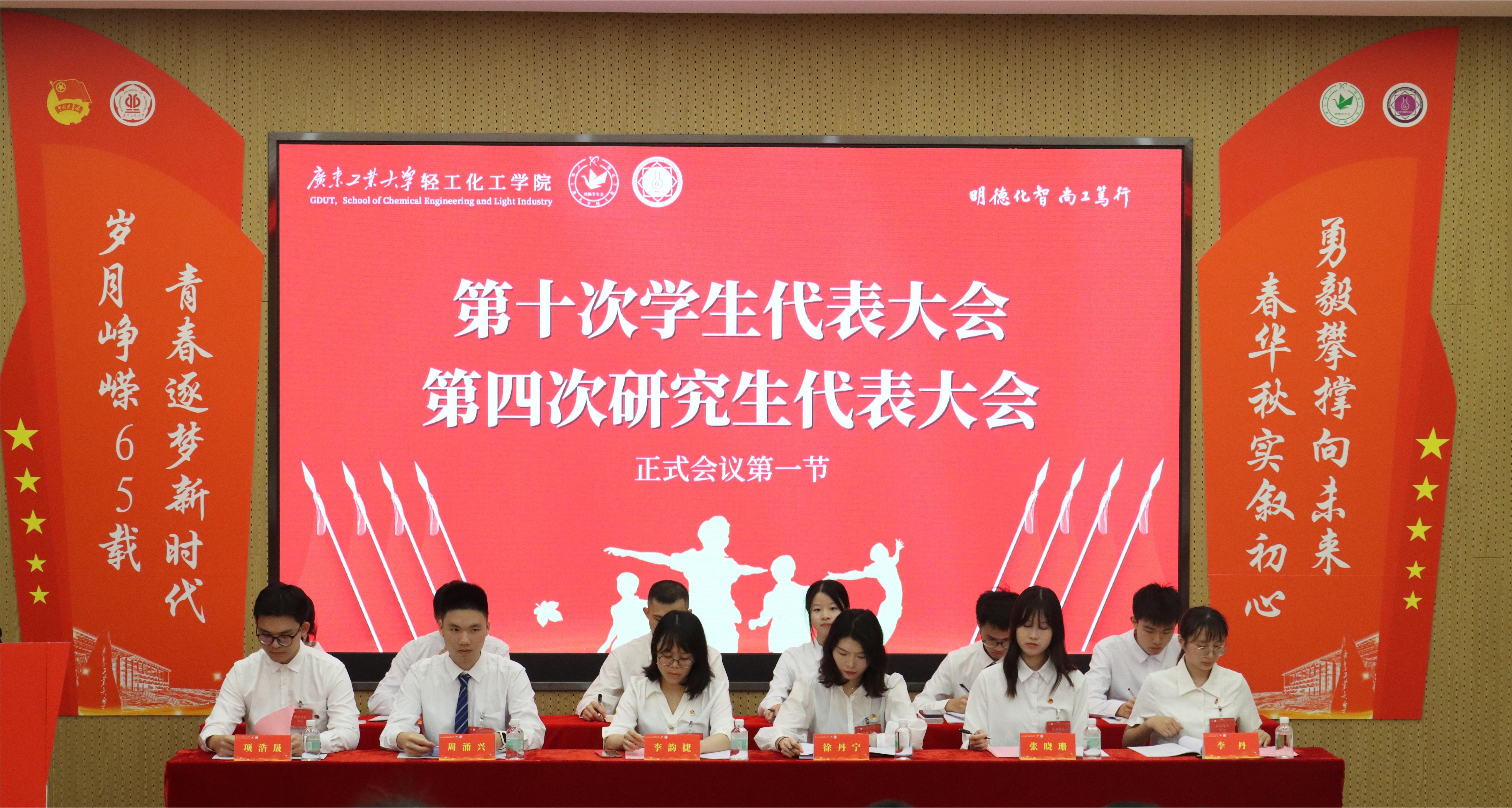 第十次学生代表大会暨第四次研究生代表大会在大学城校区工学一号馆学术报告厅顺利召开。校学生会执行主席吴业伦、校研究生会执行主席黎秋茹,学院党委副书记杨刚、学院团委指导老师李韵捷,兄弟学院学生会、研究生会主席团成员,轻工化工学院辅导员老师及54名本科生代表和40名研究生代表参加本次会议。会议由学生会秘书长徐丹宁、研究生会秘书长项浩晟等人主持。