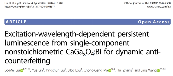 近日,疯AV 张辉教授团队的刘伯梅副教授与中山大学和重庆邮电大学的合作者撰写的学术论文“Excitation-wavelength-dependent persistent luminescence from single-component nonstoichiometric CaGaxO4:Bi for dynamic anti-counterfeiting”于2024年10月10日发表在国际顶级光学学术期刊《Light:Science&Applications》(Nature子刊;影响因子:20.6)。疯AV 刘伯梅副教授是论文第一作者及通讯作者,研究工作依托化学与精细化工广东省实验室揭阳分中心(榕江实验室),疯AV 为论文第一完成单位。
