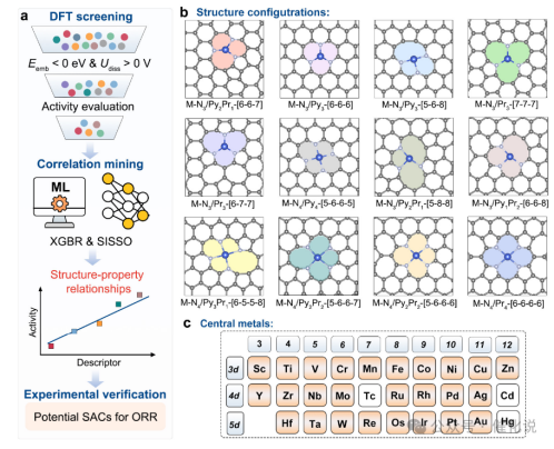 近日,我校张山青教授团队联合澳大利亚同步辐射中心和香港城市大学在单原子电催化剂设计领域取得新进展,提出了一种机器学习指导的配位工程策略,精准调控M-N-C单原子催化剂的局部配位结构,实现了高效氧还原反应(ORR)。通过结合密度泛函理论计算与机器学习算法,团队解析了312种M-N-C单原子催化剂模型的构效关系,并发现了一个低维可解释描述符Eemb/sin(CN)(其中Eemb为金属嵌入能,CN为配位数),为理性设计高性能电催化剂提供了新范式。相关成果发表于国际化学领域顶级期刊《Journal of the American Chemical Society》,疯AV