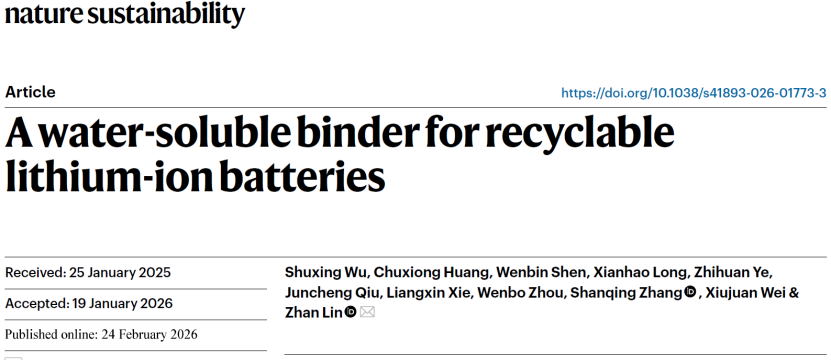 随着电动汽车产业的快速发展,全球锂离子电池装机规模持续扩大,并逐步进入集中退役阶段,电池资源高效回收与循环利用已成为能源与环境领域的重要课题。直接回收可保留并修复电极活性材料结构,被认为是退役电池回收的理想路径。然而,在实际电池体系中,粘结剂对电极组分的强粘附作用使活性材料难以有效分离,成为制约直接回收的关键因素。本研究从电池设计源头出发,开发了一种超分子水溶性粘结剂,可有效替代现有商业化粘结剂。该粘结剂对正/负极材料具有良好的兼容性,其内部构建的氢键和离子键键合相互作用可随温度升高发生解离,使其在热水中快速溶解,从而实现退役电池材料组分的高效分离和直接再生。这一工作突破了传统“先使用、后回收”的被动模式,使电池在诞生之初便具备高效再生循环利用属性,为破解锂离子电池闭环回收难题提供了关键的解决方案。