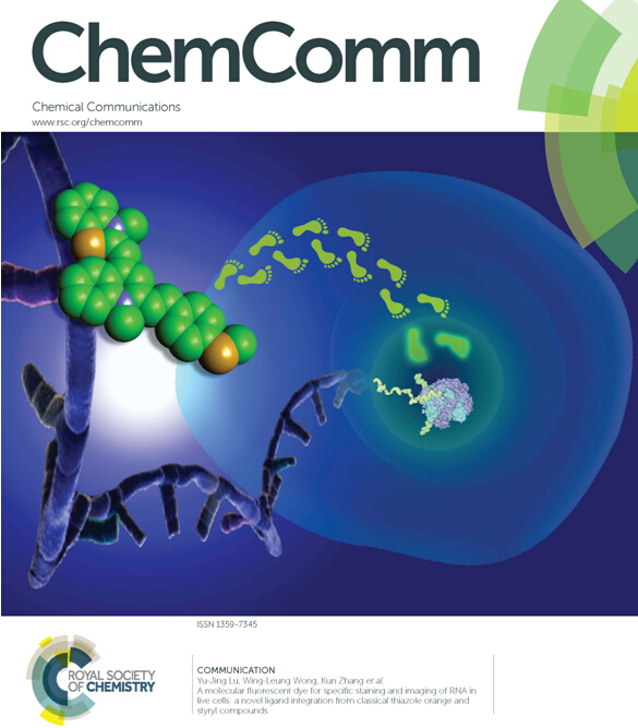天然药物与绿色化学研究团队、制药工程系卢宇靖副教授、张焜教授等人在特殊核酸RNA/G-四螺旋DNA专一性荧光探针领域取得重要进展。系列成果发表在英国皇家化学会《Chemical Communications》、《Analyst》和《Dyes & Pigments》等国际知名学术期刊,其中论文“A molecular fluorescent dye for specific staining and imaging of RNA in live cells: a novel ligand integration from classical thiazole orange and styryl compounds.ChemComm,2015, 51, 15241-15244”被邀请作为该期封面文章(Inside Front Cover)。该成果引起了全球领先的生化试剂与诊断试剂公司美国Promega Biosciences的关注,主动寻求进一步开发合作以及知识产权转让。
