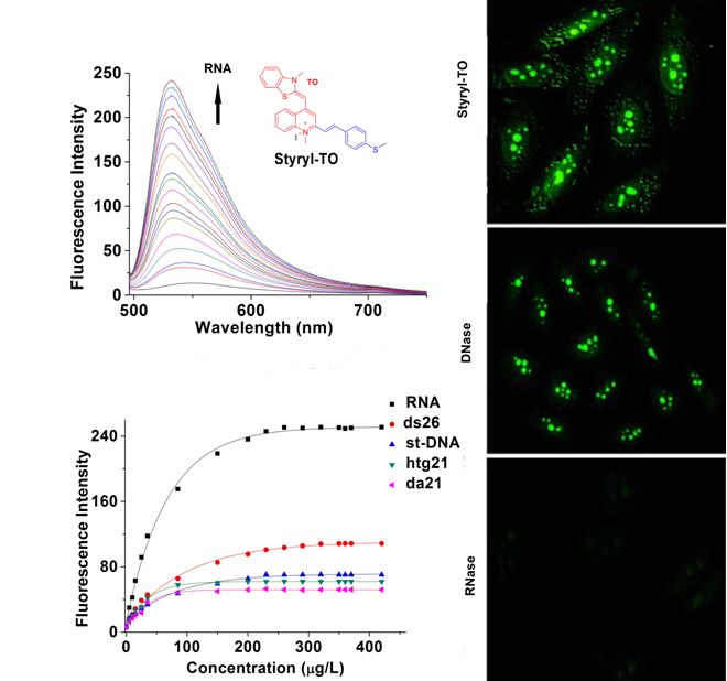 噻唑橙(TO)是使用最广泛的非专一性核酸荧光染料,但无法选择性识别不同的核酸二级结构。在课题组成员的共同努力下,通过整合经典核酸荧光染料TO和苯乙烯化合物,开发出一种新型高灵敏选择性RNA荧光染料Styryl-TO。该染料能标记或显示活细胞中RNA的存在,而对细胞中的DNA无明显的荧光响应。Styryl-TO对细胞成像效果与商品化的SYTO RNASelect相当。此外Styryl-TO的响应速度和光学稳定性优于SYTO RNASelect。因此,Styryl-TO作为RNA荧光染料具有进一步商品化开发的潜力。