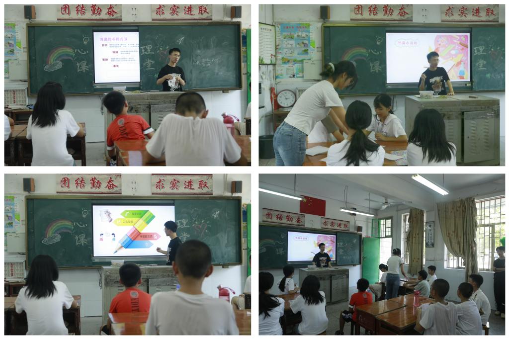 沟通无距离,关爱在身边。针对留守儿童的成长环境,团队成员们为先锋小学的孩子们精心设计了一堂以“沟通”为主题的心理小课堂,希望孩子们学会有效沟通,正确表达自己的需求,迈向更健康的成长之路。成员们首先通过“你说我做”的小游戏引入课堂,引起了孩子们的兴趣。紧接着,成员们为孩子们讲解了日常生活中进行有效沟通的方式,通过情景再现、现场提问、自主回答等形式将课堂拉向高潮,孩子们从一开始的不敢表达,转变为勇敢地发言。“孩子们勇于正确地、清楚地表达自己的需求,孩子们身边的亲人与老师才能及时察觉他们的动态和问题进行有效地干预与疏导。我们希望通过这堂课能够让孩子们学会有效沟通,促进他们的健康成长。”服务队的成员如是说。