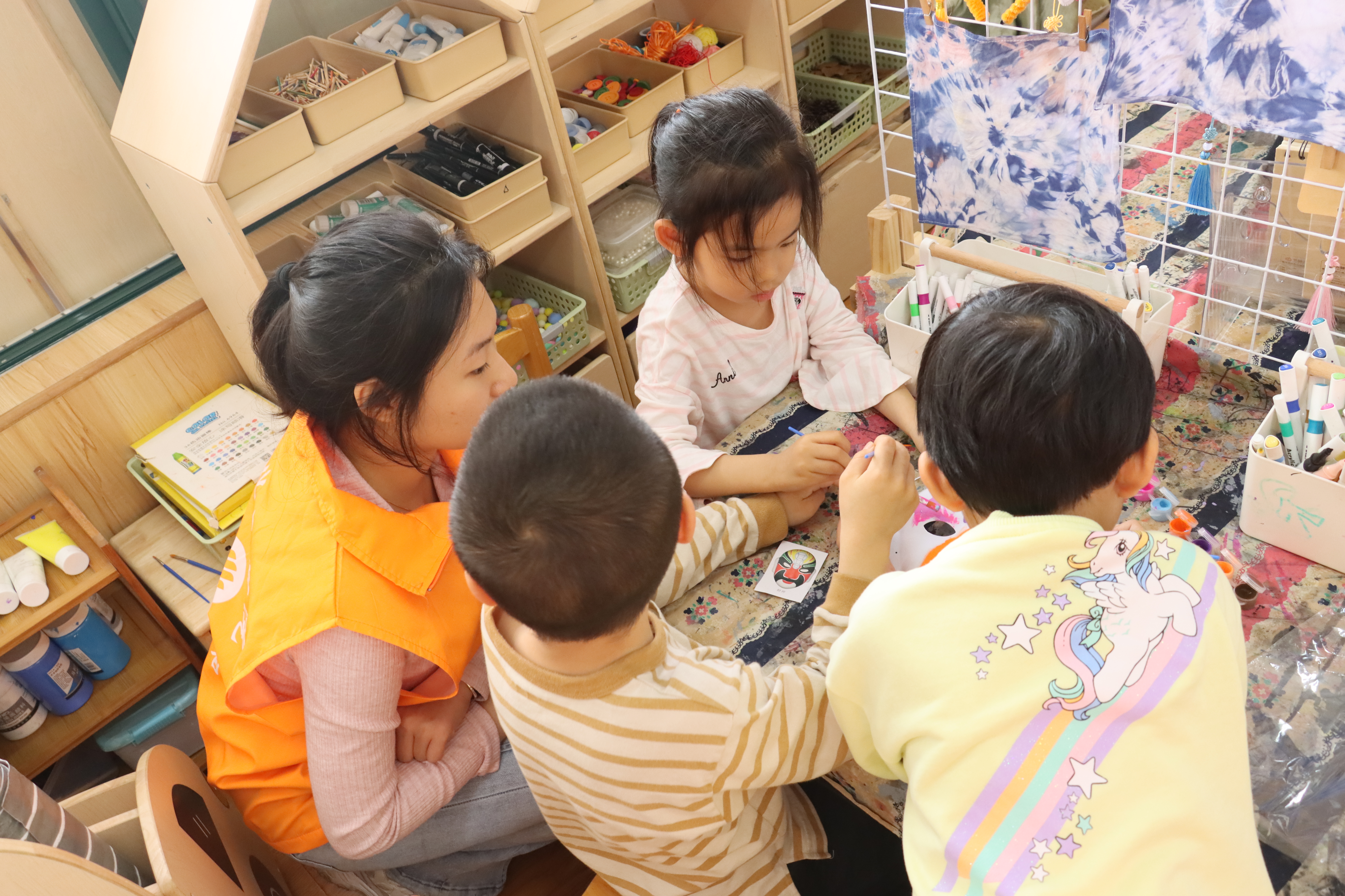 授课过程时,志愿者们不断地提出简单的问题引导小朋友们积极参与回答,并且为每位回答问题的小朋友准备了粤剧贴纸,以调动小朋友们的积极性。在课程的实践环节,志愿者们各自负责2-3个小朋友,与他们一同描绘粤剧脸谱的每一个细节。